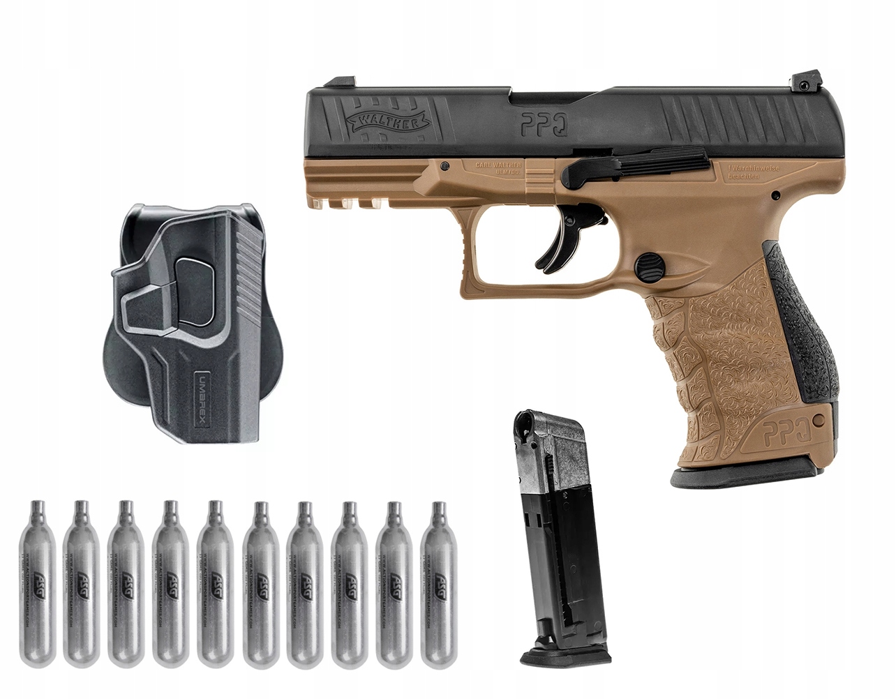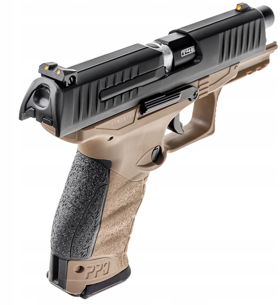 Боевой пистолет Walther PPQ M2 T4E FDE RAM CO2, направляющая RIS, магазин на 8 пуль + полимерный чехол для транспортировки + шомпол для чистки + запасная пружина + запасной магазин + полимерная кобура + 10 капсул CO2