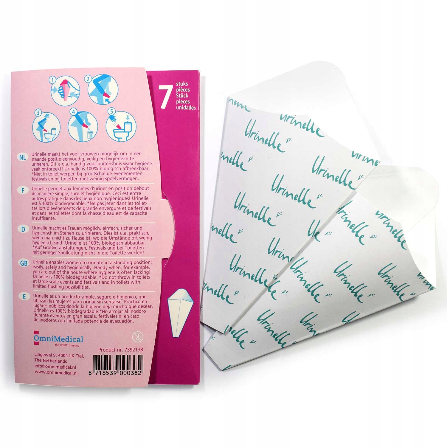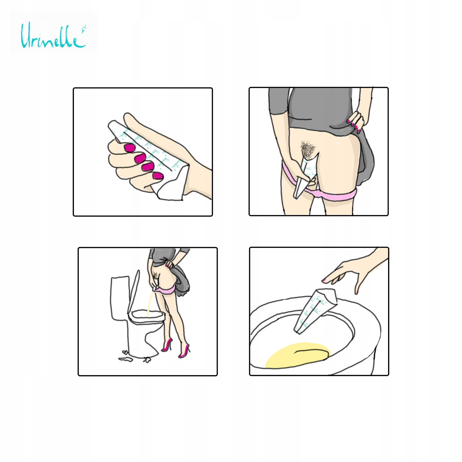 В положении стоя разверните Urinelle и поместите трубку анатомической формы на вульву, слегка надавив. Теперь можно мочиться свободно и гигиенично, без каких-либо затруднений. Urinelle устойчив к моче, но биоразлагаем, поэтому его можно смывать в унитаз.