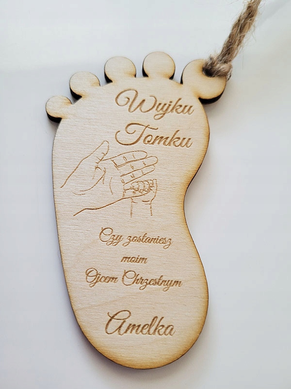 Красивые деревянные подвески на ножки для подарка будущим крестным родителям с вопросом ребенка. Просьба тете и дяде упакована в стильную сумку с древесной ватой и бантиком из джутовой веревки. Оригинальная форма расспроса о крестных станет отличным сувениром на будущее. Деревянный кулон украшен точной индивидуальной гравировкой и джутовым бантиком. Изысканный набор из двух подвесок (на левую и правую ногу) для обоих крестных.