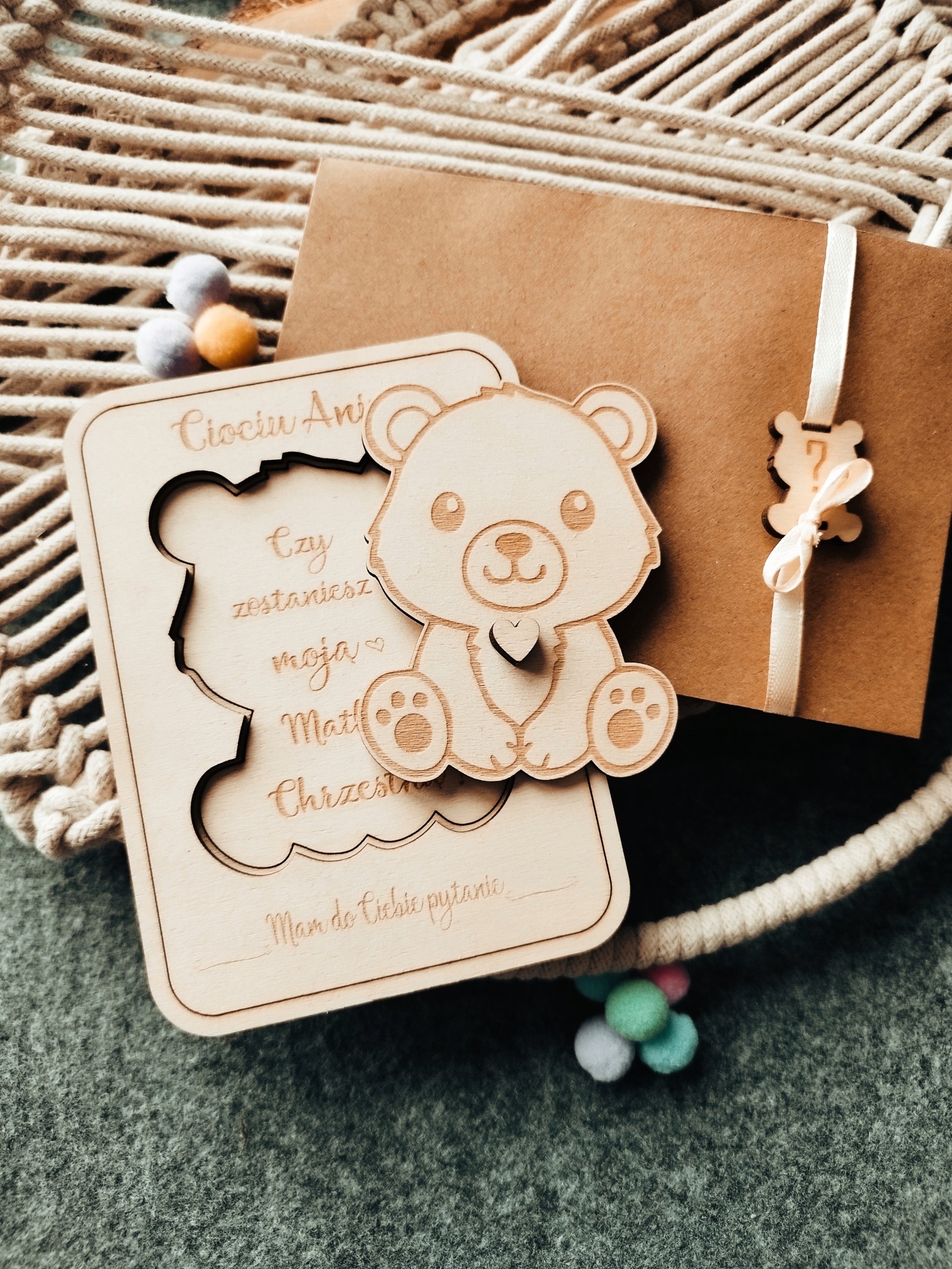 Приглашение упаковано в стильный конверт с джутовой веревкой и деревянным мишкой и готово к вручению.