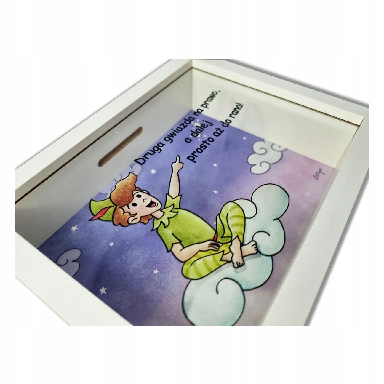 Сказочная копилка из белого дерева и стекла. Экономия видна за стеклом, на котором красочно изображен Питер Пэн и цитата. На заднем плане красочный декор, создающий 3D-эффект. Содержимое можно вынуть сзади.