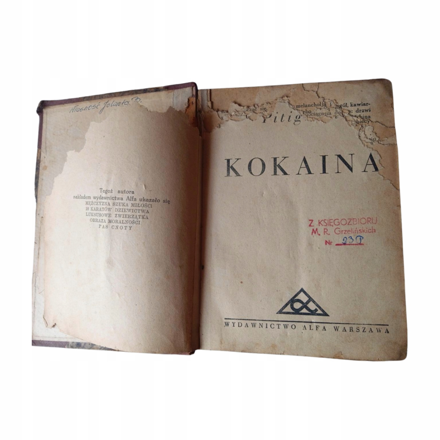 Предлагаю на продажу книгу: Кокаин. Автор: Питигрилли. Издательство: Wydawnictwo Alfa, 1931 г. Скандальный эротический роман, написанный в 1922 г. Твердый переплет, 233 страницы Состояние среднее. Обложка грязная, углы погнуты и потерты. Тканевый корешек обложки частично порван. Края страниц грязные. Страницы слегка пожелтевшие, некоторые грязные. Первые 10 листов частично разорваны, фрагменты отсутствуют примерно на 1/3 поверхности. Нижняя часть последней страницы под текстом была оторвана. На некоторых страницах стоит печать частной книжной коллекции.