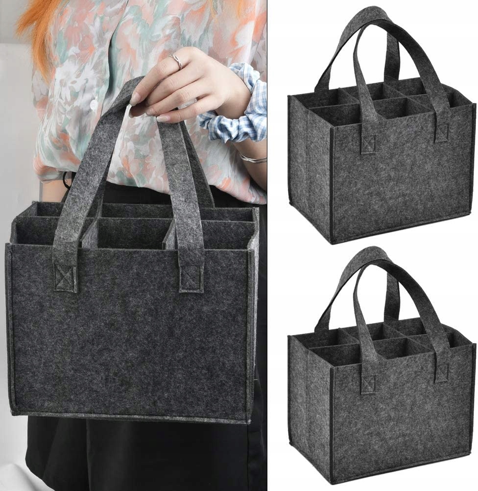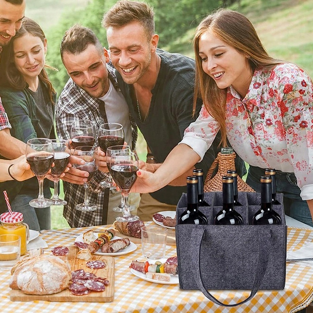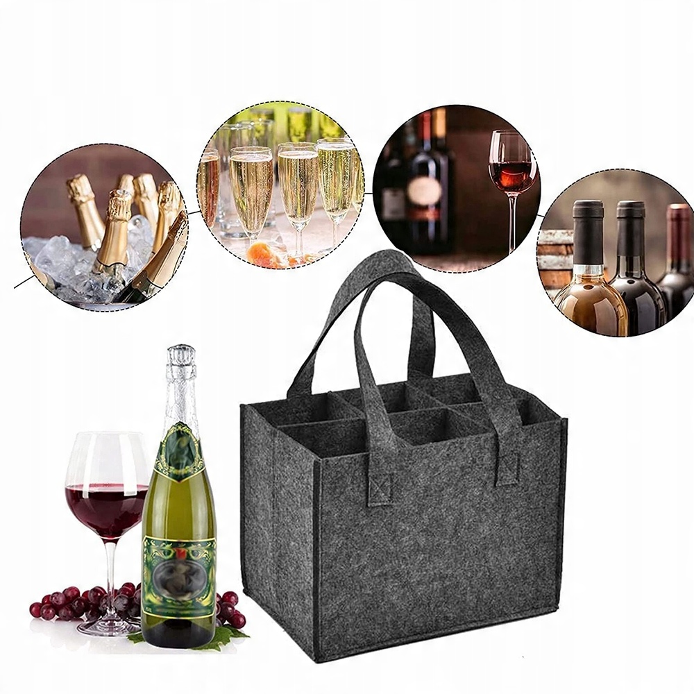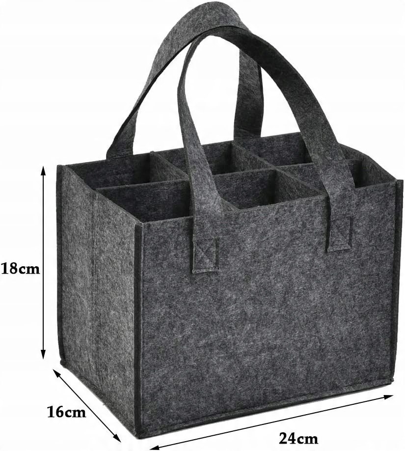- Мы предоставляем2 фетровых мешка для вина,каждый фетровый мешок вмещает6 бутылок. Размер винного мешочка 24*18*16 см. Кстати, этим многоразовым фетровым мешком можно делиться. Вам не нужно беспокоиться о повреждении винных бутылок и о шуме, вызванном трением между винными бутылками.