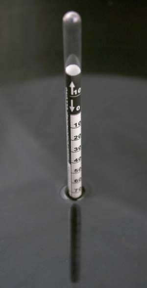 Чаще всего, когда начинается брожение столового вина, оно показывает на шкале значение примерно 75, т. е. много сахара (около 4,5 кг на замес 23 л). Во время брожения сахар расходуется и ареометр опускается глубже. Когда брожение закончится, оно должно показать значение ниже нуля, т. е. примерно от -5 до -10. Если показание выше, это означает, что вино все еще бродит или брожение остановилось.