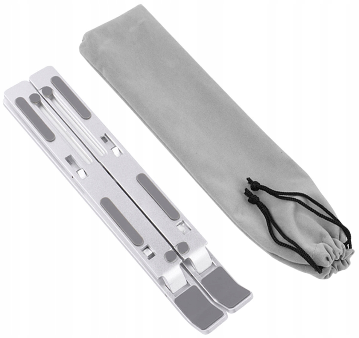 Алюминиевый складной столик для ноутбука. Характеризуется легкой и прочной конструкцией. Это позволяет комфортно пользоваться ноутбуком даже в лежачем положении. Многоступенчатая (6) регулировка наклона столешницы позволяет подогнать стол под нужды пользователя. Это чрезвычайно эргономичное решение, повышающее комфорт использования ноутбука. Регулируемые кронштейны позволяют размещать на подставке небольшие устройства, такие как планшеты и смартфоны. Силиконовые накладки внизу предотвращают скольжение подставки и возможные царапины.