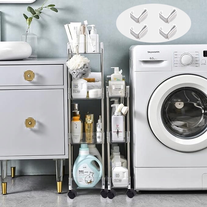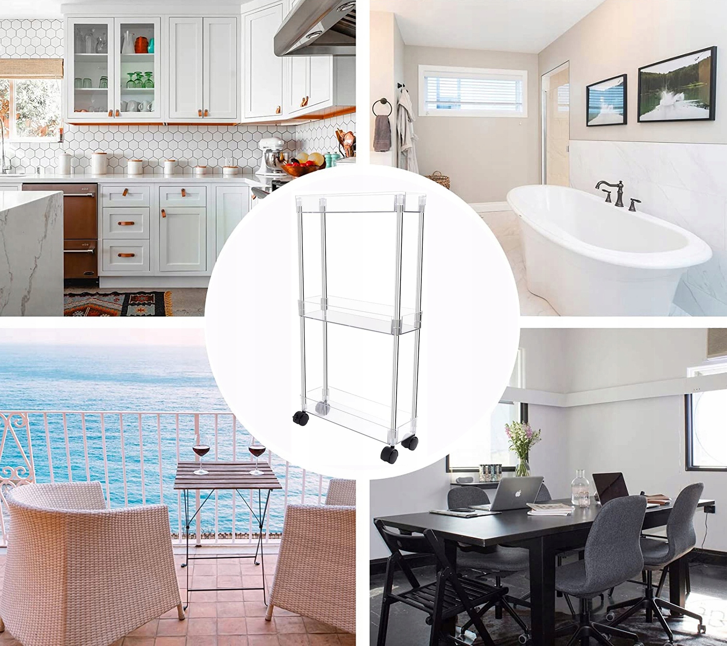 Эту тонкую полку-тележку можно использовать как кухонную полку, тележку для ванной, органайзер для коляски, тележку для спальни/гостиной. Идеально подходит для небольших помещений, таких как туалеты, кухни, ванные комнаты, гаражи, прачечные, офисы или между стиральной машиной и сушилкой.