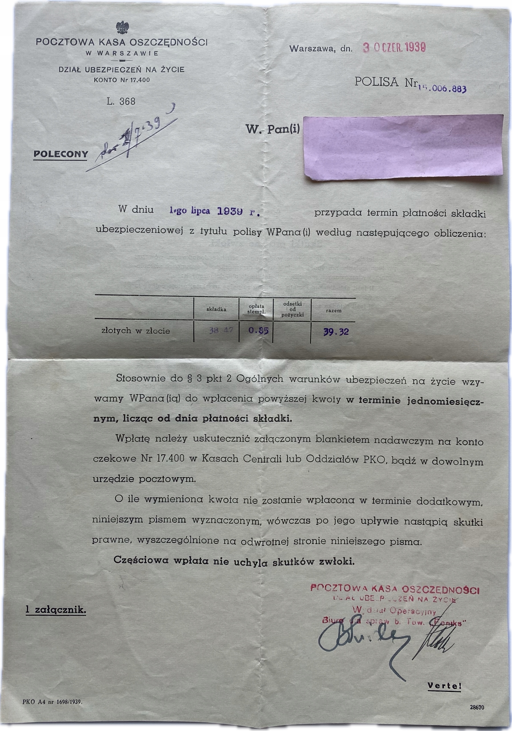 PKO ВАРШАВСЬКИЙ ПОЛІС ЛИСТ СТРАХУВАННЯ ЖИТТЯ ПОШТОВІ НАКАДЖЕННЯ ГОТІВКА