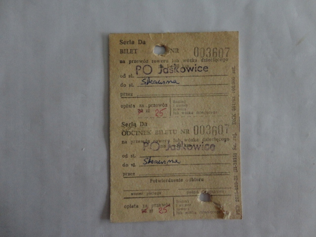 PKP BILET NA PRZEWOZ ROWERU JASKOWICE SKAWINA 1985