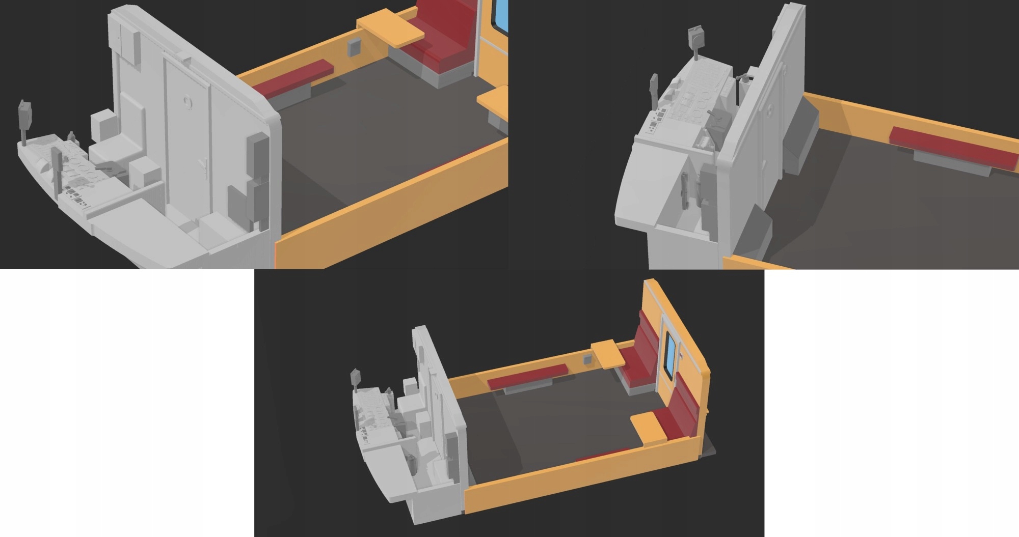 Внутренняя модель содержит все важные детали, в том числе: дверные ручки, аварийные тормоза, совки, столы, глазки в дверях, комплектные пульты управления и т. д.