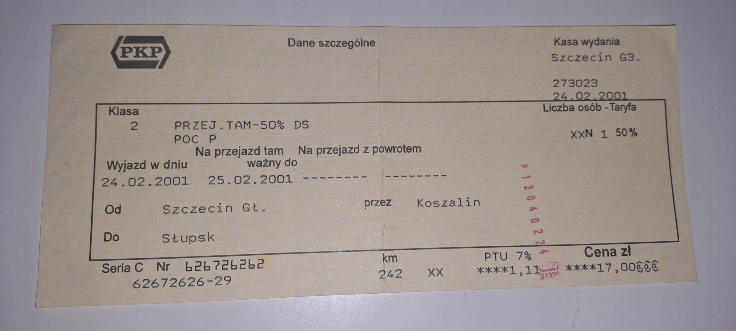 ПКП ЩЕЦИН - СУПСК / КОШАЛИН Ж/Д БИЛЕТ