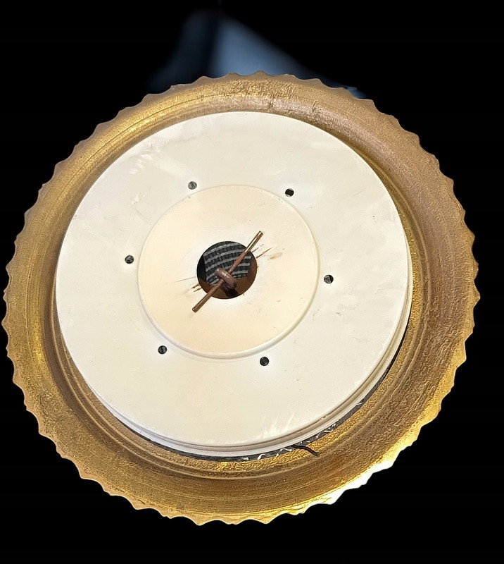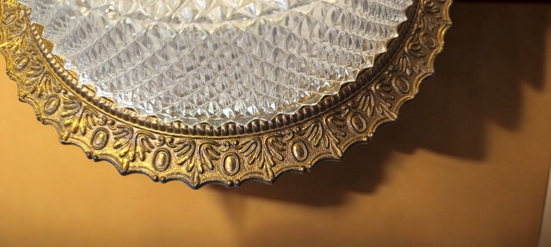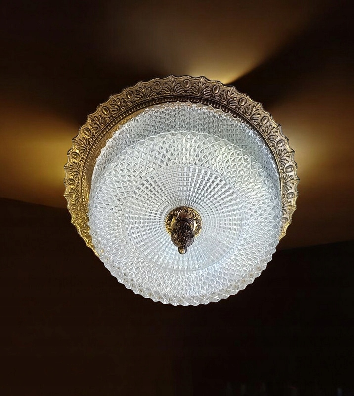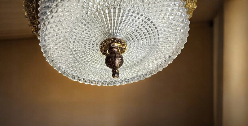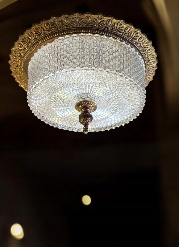 Из стекла с металлической конструкцией и латунным воротником; был импортирован из Франции. Стеклянный абажур рассеивает преломленные световые лучи, давая яркий и теплый свет. Несмотря на возраст (около 40-50 лет), состояние очень хорошее.