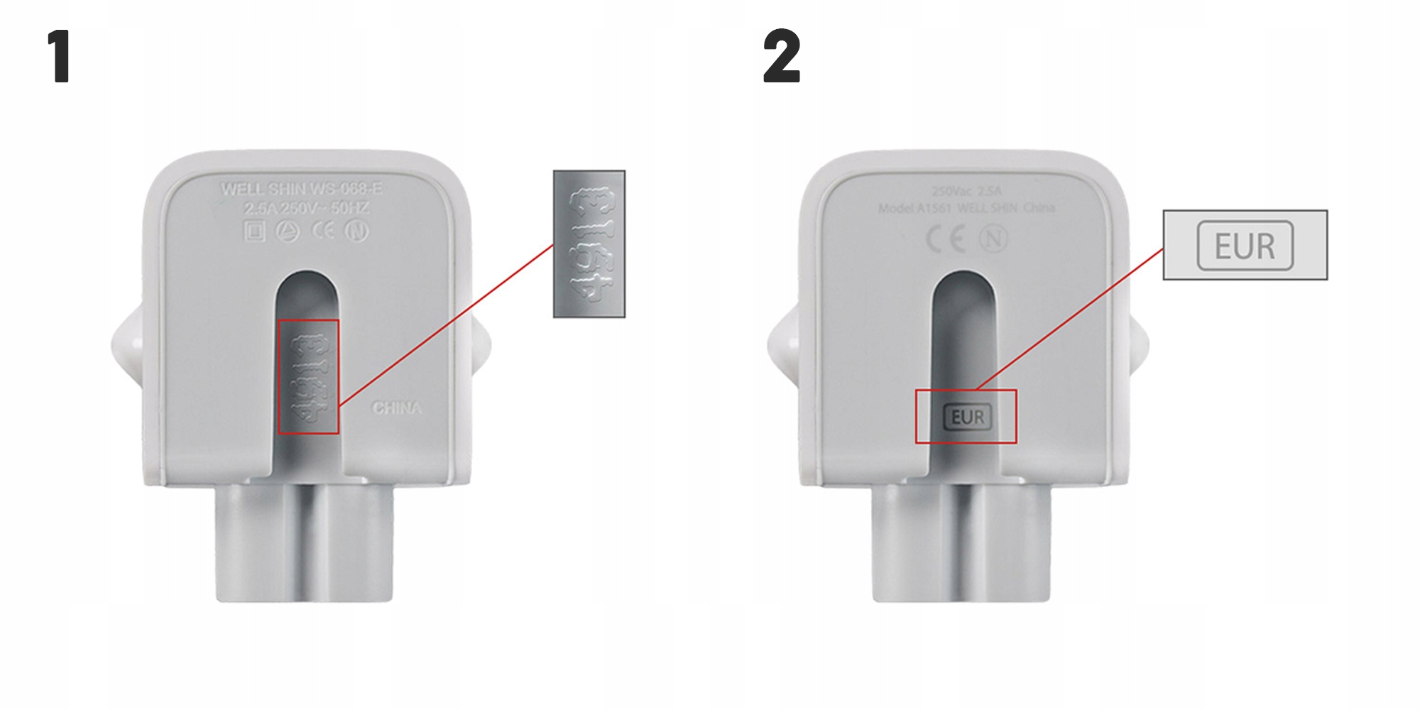 Вы должны сравнить источник питания с иллюстрациями ниже. Благодарность питания с заглушкой для настенного розетки, которая может вызвать проблемы, имеет 4 или 5 символов, или во внутреннем гнезде нет символов, подключенных к источнику питания Apple. Перепроектированные источники питания имеют 3-литровый региональный кодекс в гнезде (Eur, Kor, AUS, ARG или BRA).