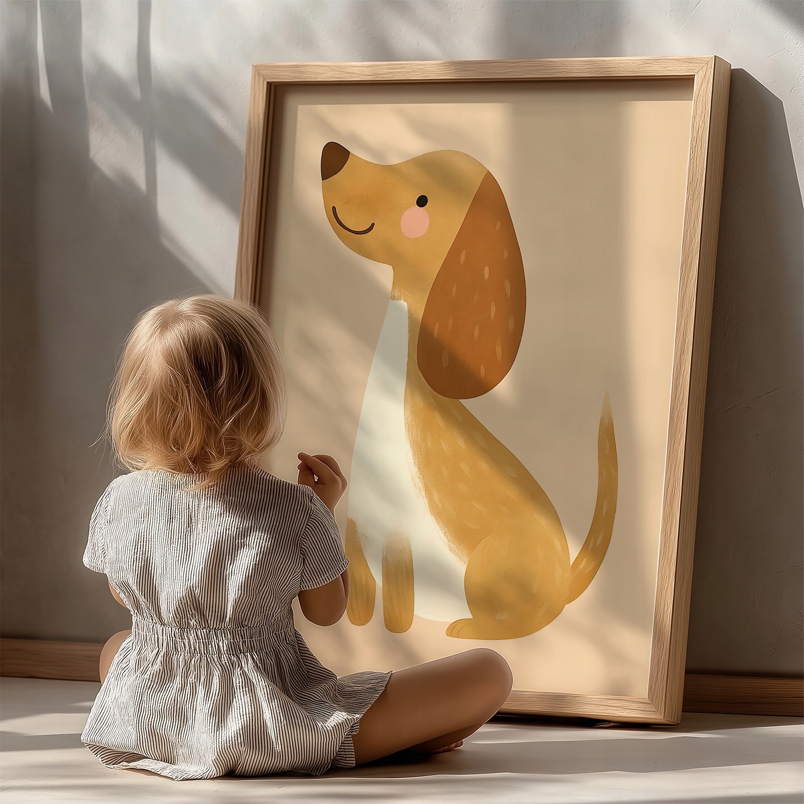 радостная собака в теплых оттенках коричневого цвета была представлена в простом, сказочном стиле.