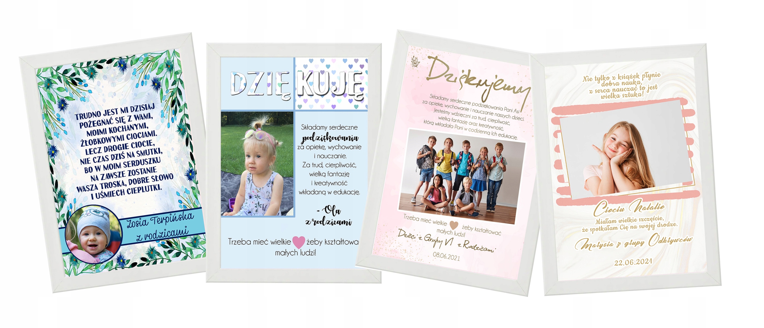 Приходит время, когда наш маленький малыш, который был в яслях или детском саду ей предстоит попрощаться со своей нынешней «тетей» и всей группой детей отправиться на встречу с новыми друзьями, коллегами и новой тетей. Мы подготовили для вас плакаты с фотографией ребенка и благодарностью дам из яслей, детского сада и школы. Вы можете изменить свои пожелания по своему желанию. Мы напечатаем для вас любой текст. Символичный подарок, но, несомненно, доставляющий много радости и мотивации женщинам, которые заботятся о детях.