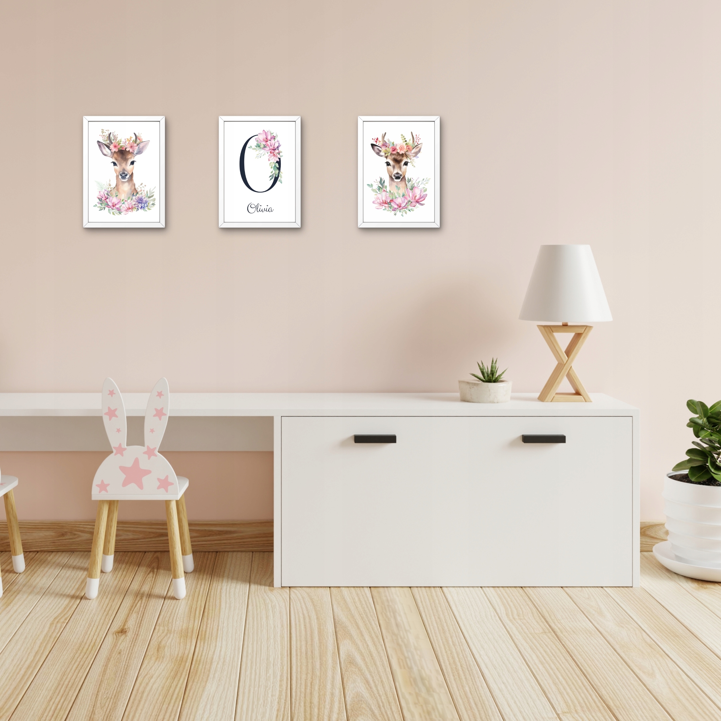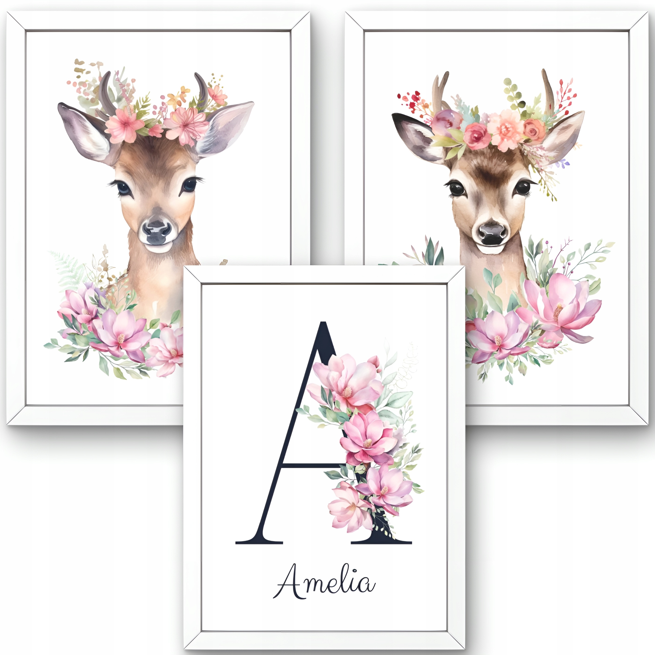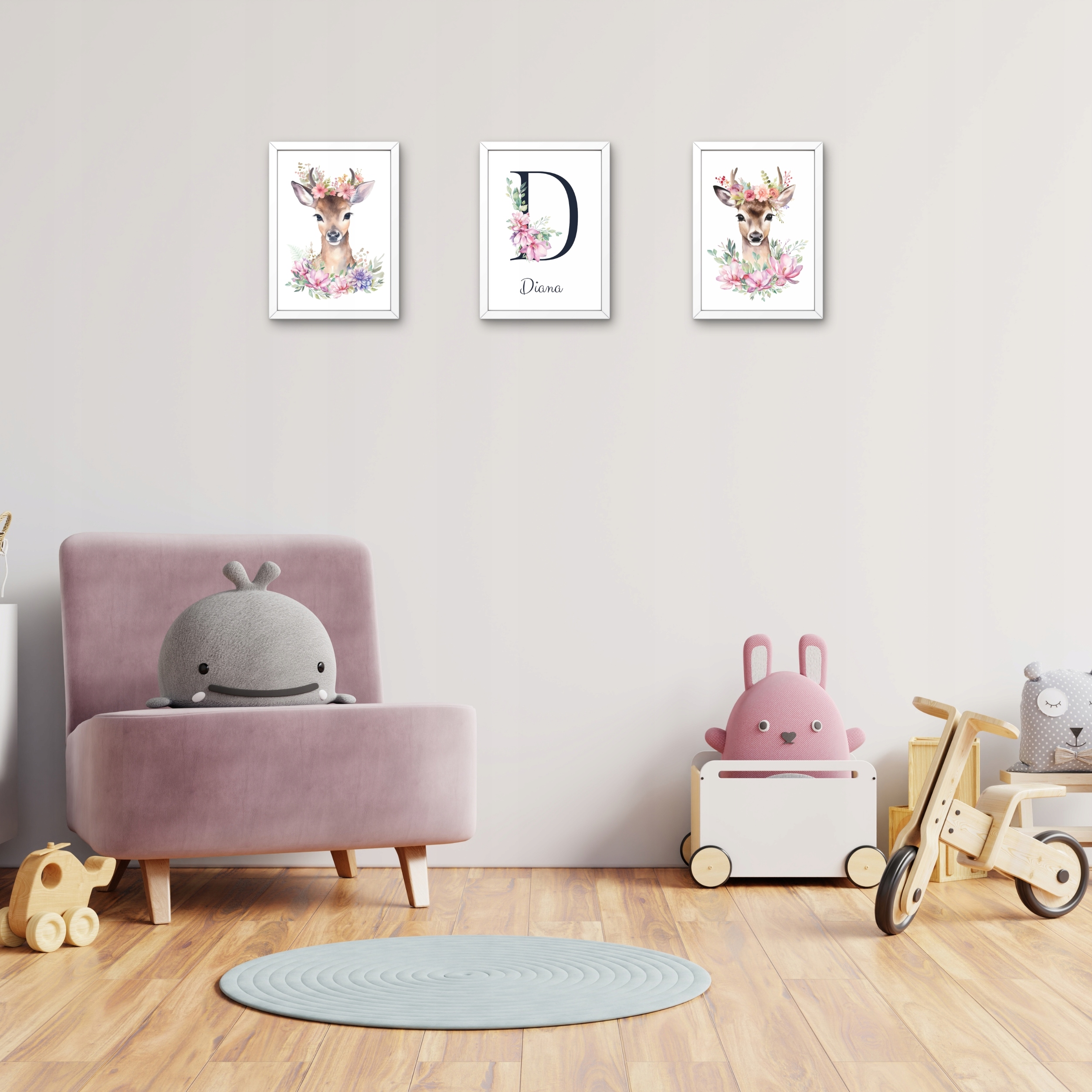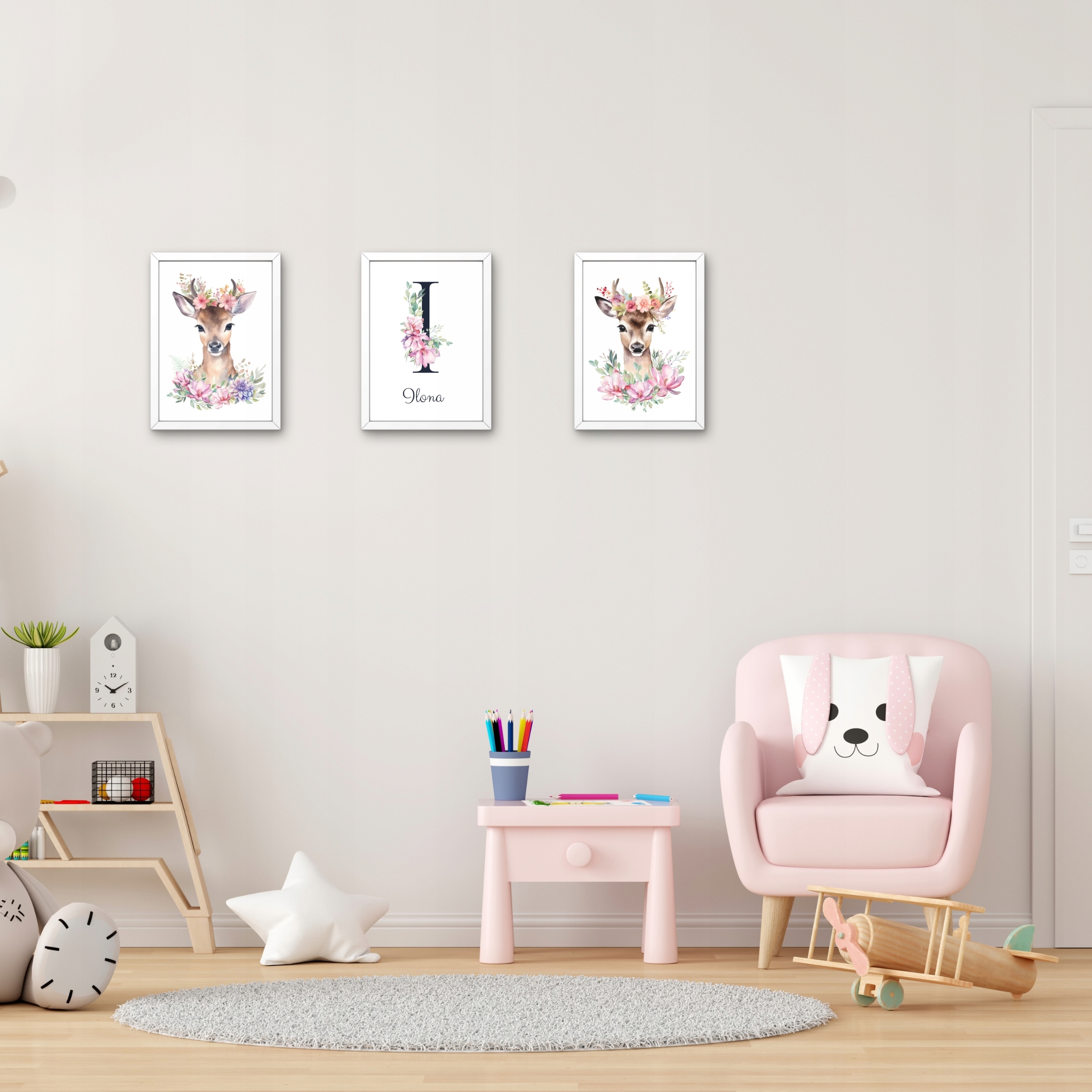 Картинки для детской комнаты / Набор из 3 постеров А4 Животные Цветы Имя ребенка