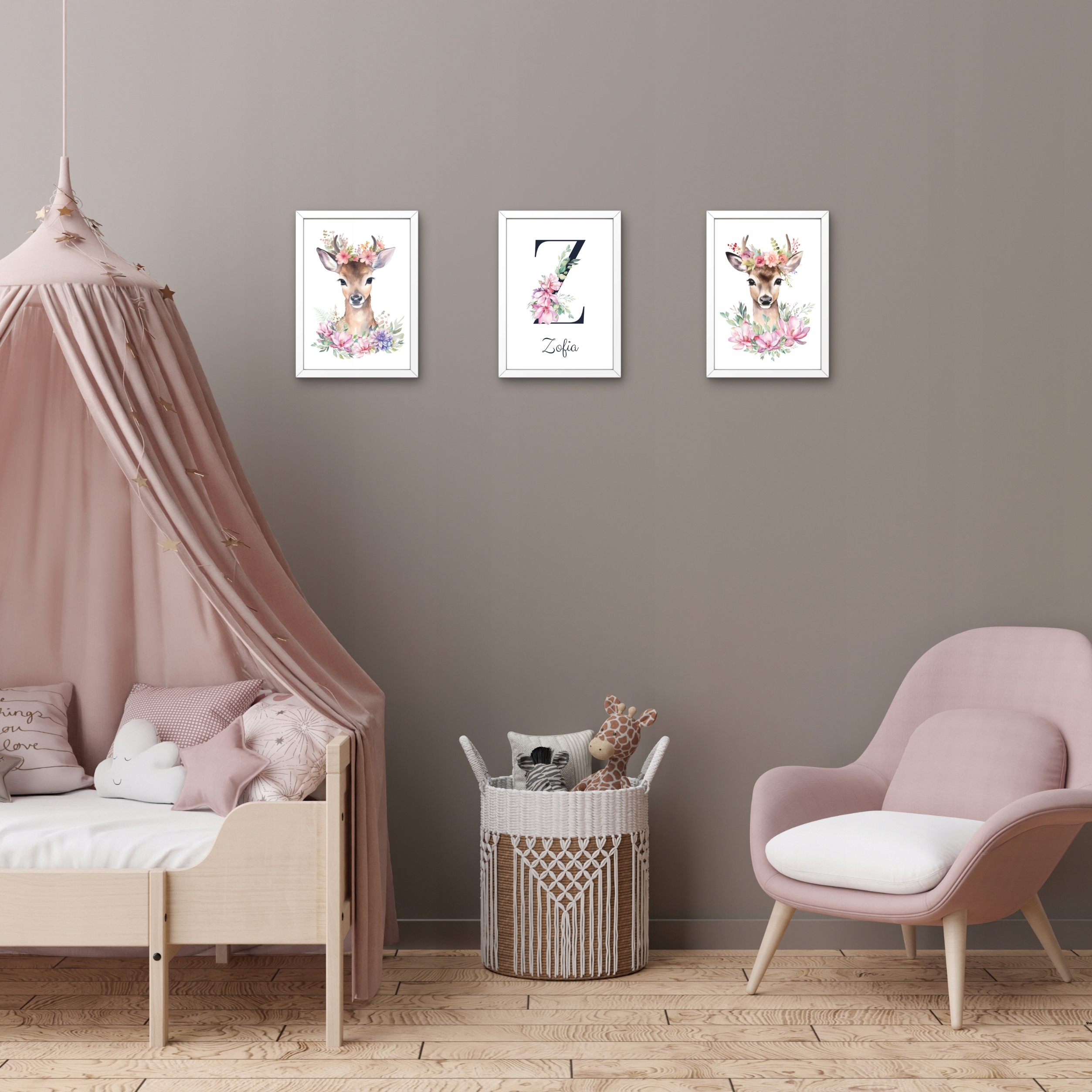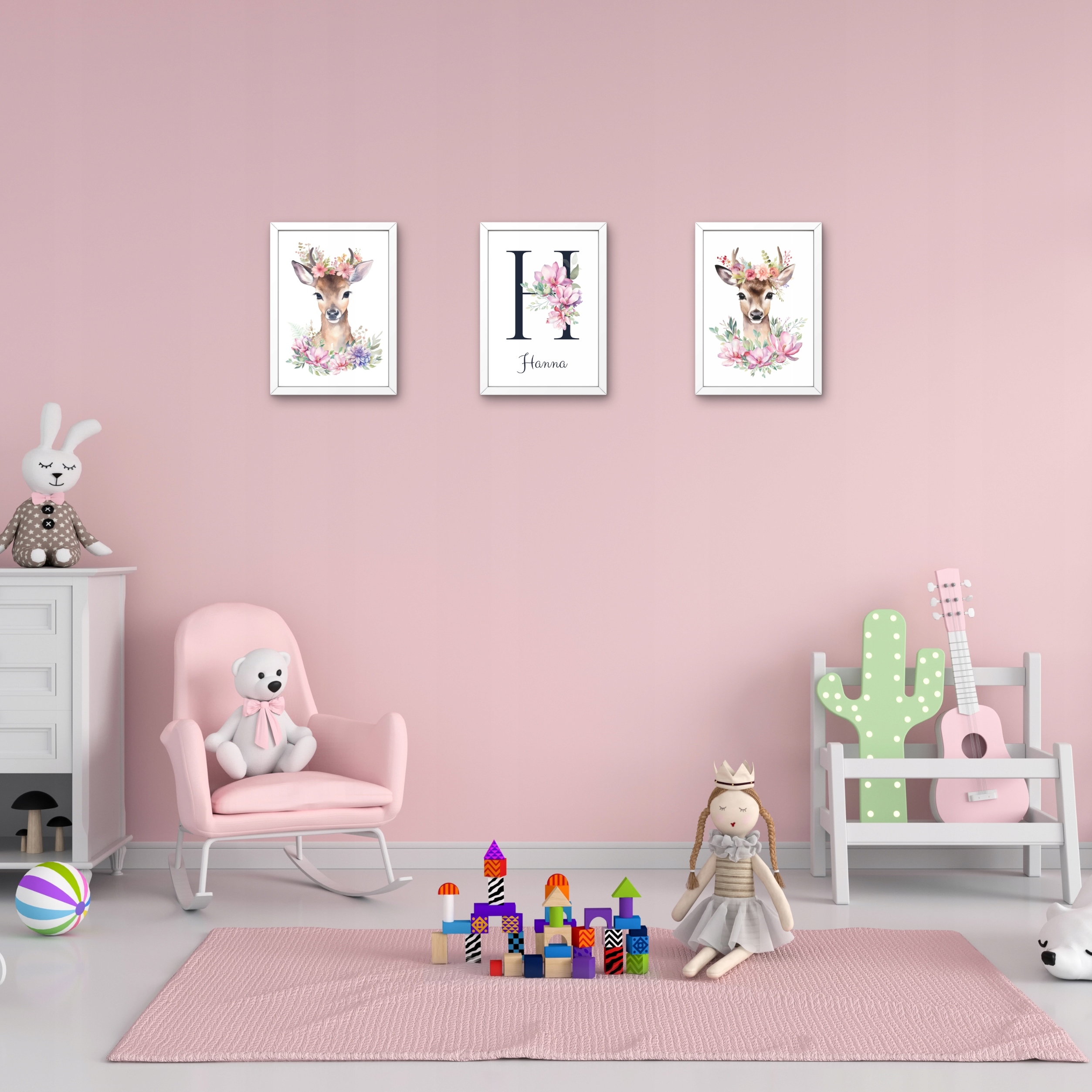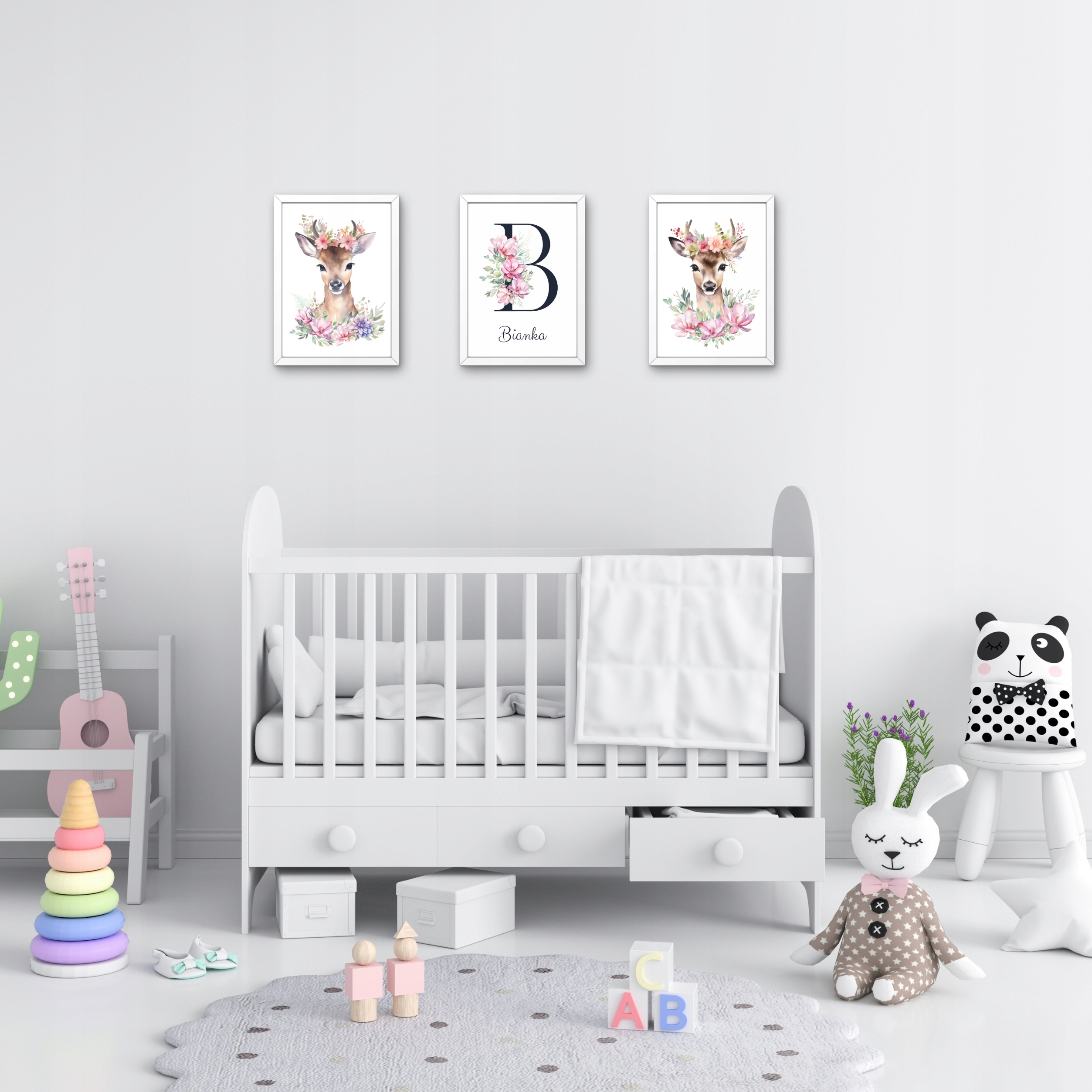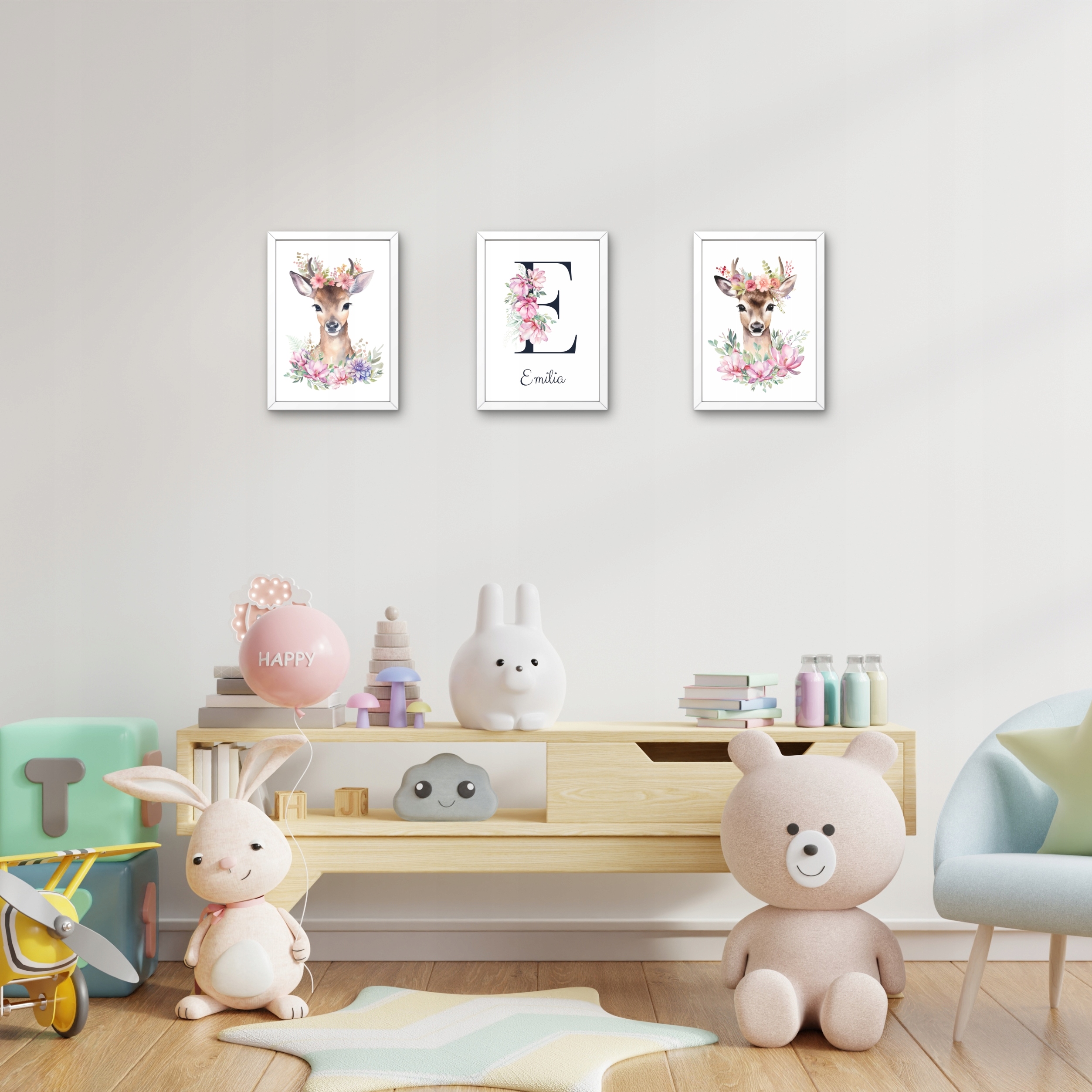 Картинки для детской комнаты / Набор из 3 постеров А4 Животные Цветы Имя ребенка