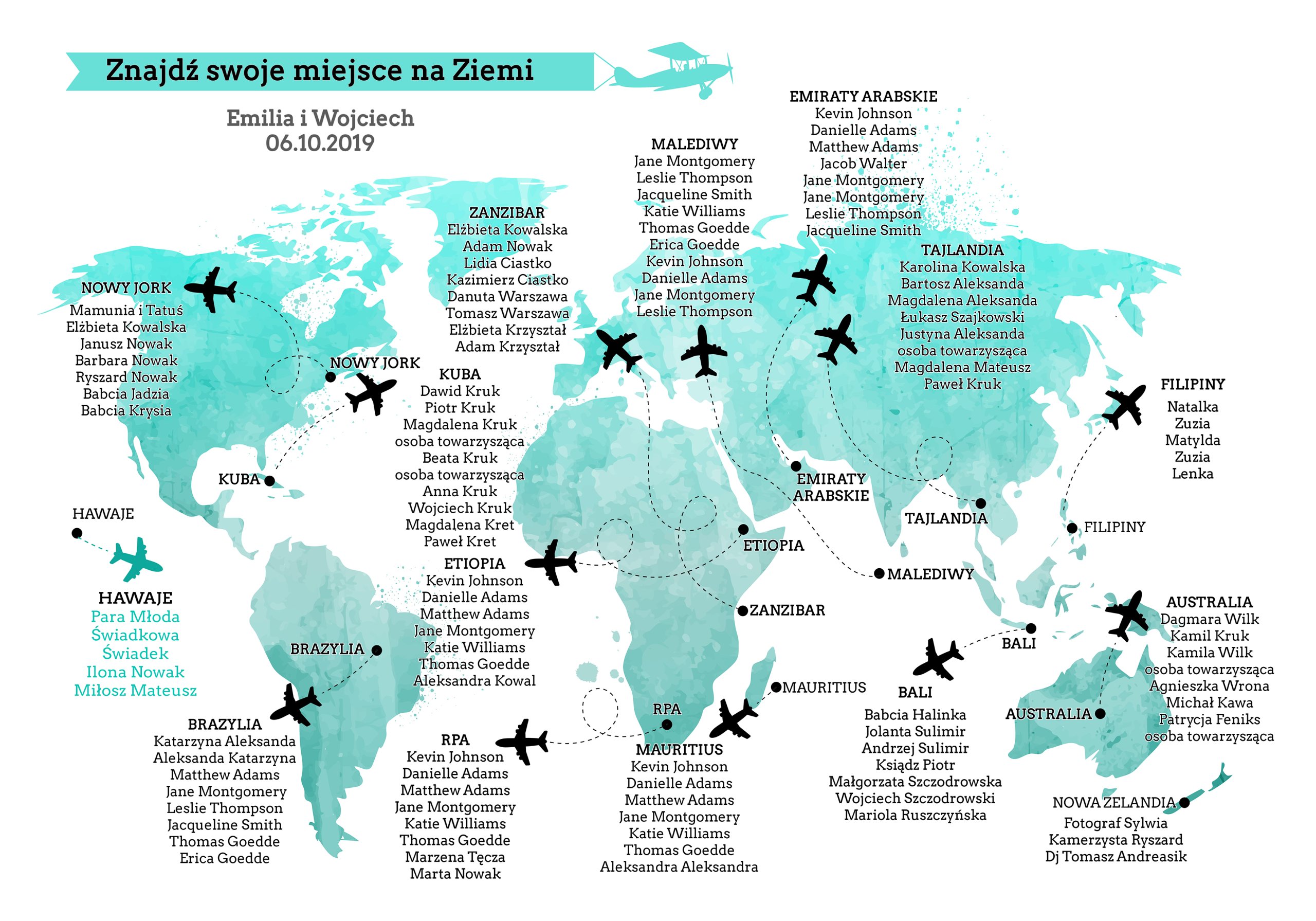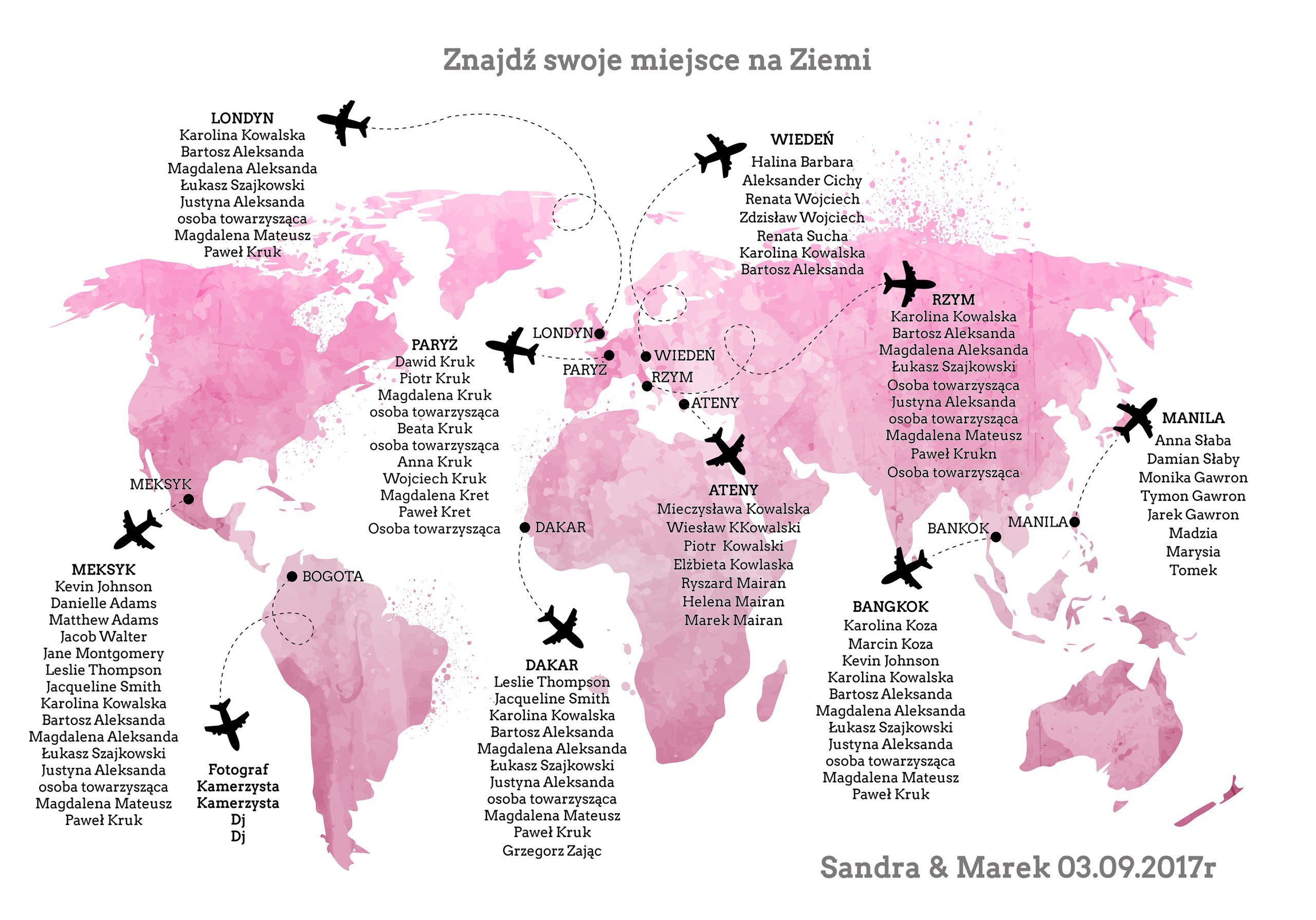 Табличный план размещены на доске в виде карты мира. Если основная тема вашей свадьбы связана с путешествиями, мы назовем в таблицах страны или столицы стран, которые вы посетили вместе.