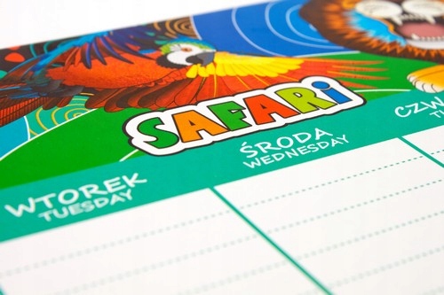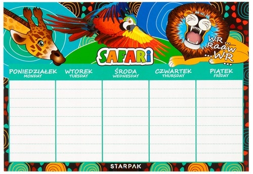 План урока является важным элементом школьного оборудования. План из коллекции Старпак с лицензией Safari включает разделение на пять дней недели с 9 строками для записи, благодаря чему ни один школьник не забудет о нужных ему в данный день книгах или тетрадях. Работа с животными сделает каждый день в школе спланированным и успешным. Также ознакомьтесь с другими продуктами Starpak с бумажным планом урока сафари. Сделано в Польше.