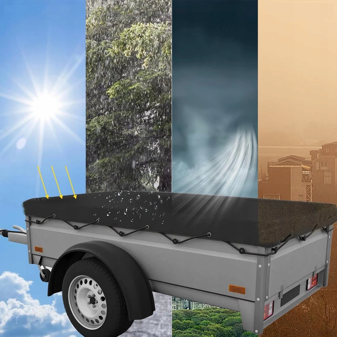 💧💧[Защита от атмосферных воздействий] – Водонепроницаемый и ветронепроницаемый брезент для автомобильного прицепа эффективно защищает груз от дождя, снега и пыли. Покрытие ПВХ предотвращает проникновение влаги, что делает изделие идеальным для длительного использования на открытом воздухе. Высокая устойчивость к УФ-излучению защищает материал от выцветания.