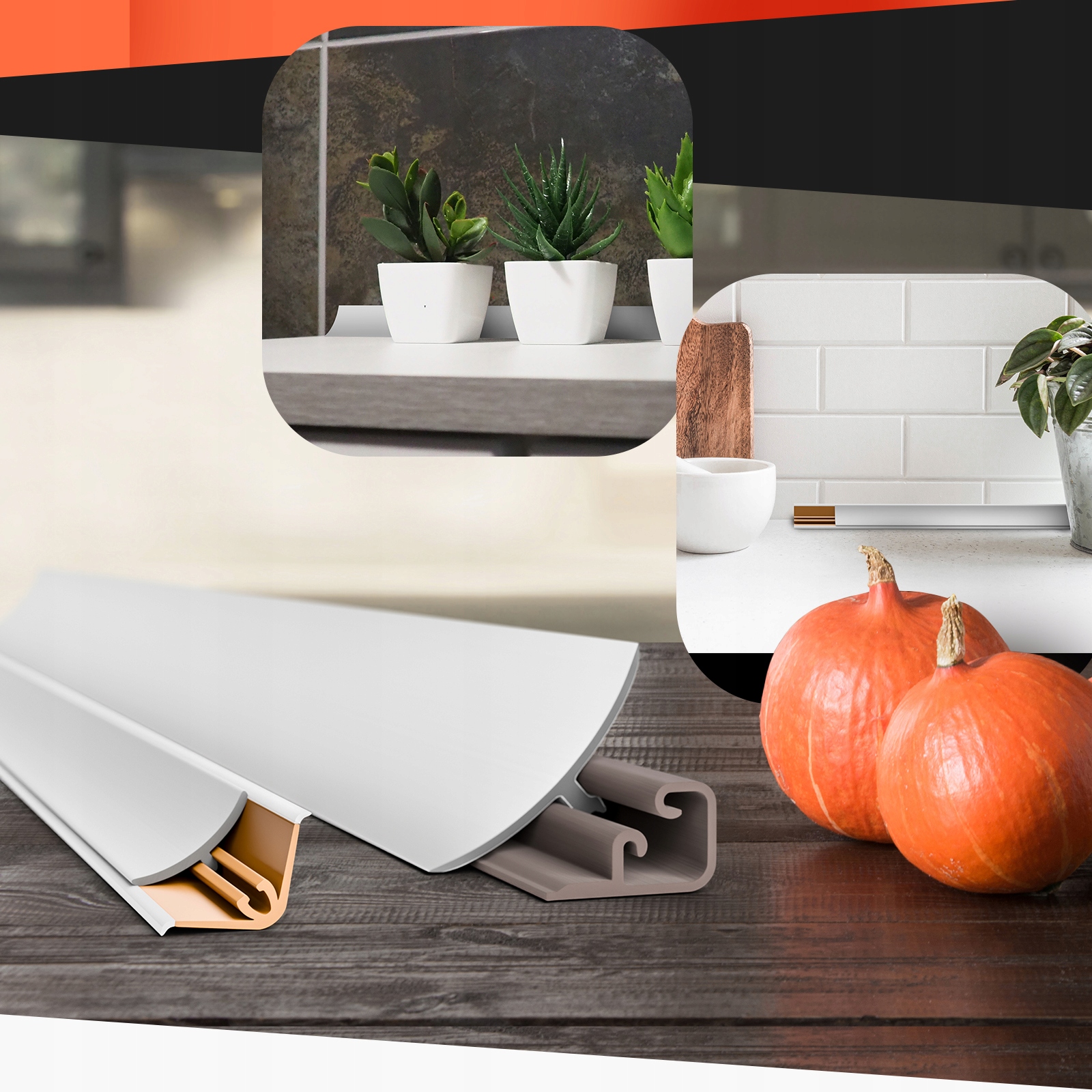 Полоски характеризуются современным дизайном, в котором прозрачные уплотнения интегрированы в монтажный профиль. Такое решение эффективно компенсирует неровности между столешницей и стеной, обеспечивая идеальное прилегание как функционально, так и визуально – независимо от цвета столешницы.