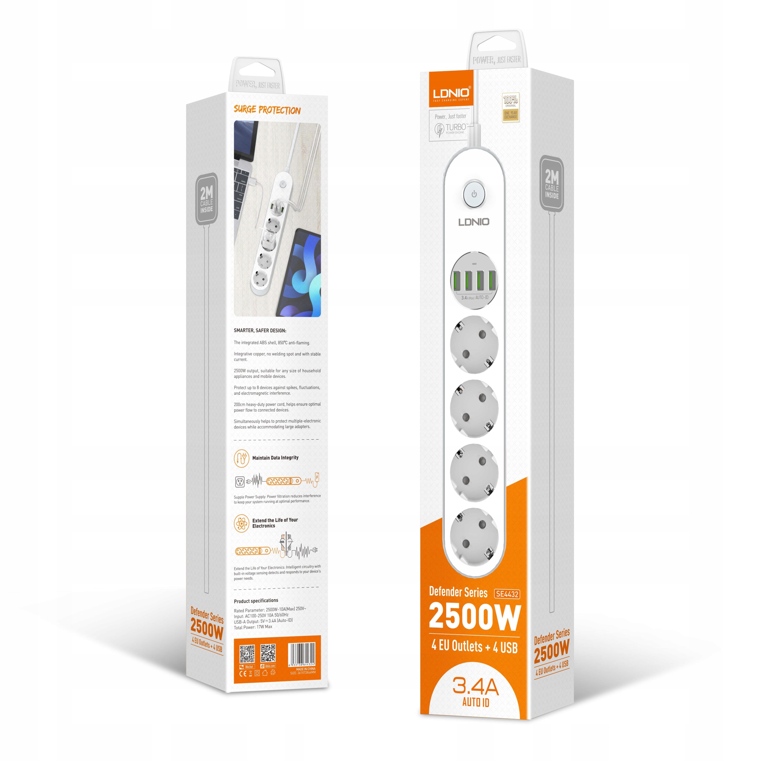 LDNIO SE4432 - надежный удлинитель, благодаря которому мы можем подключить 8 устройств одновременно. Подключаем четыре устройства со стандартными вилками питания, дополнительные четыре — к USB-портам, которые автоматически подстраивают ток подключаемого устройства максимум до 3,4А.