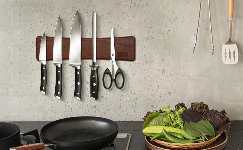 ?Улучшенная магнитная полоса для деревянных ножей?: изготовлена из высококачественной древесины акации и имеет два ряда сильных магнитов, прочных и долговечных, с более высокой силой адсорбции. Магнитный держатель ножей используется для надежного удержания ножей. Сильный магнит удерживает ножи на месте, и они не соскальзывают с магнитной подставки для ножей. Размеры: 25 см х 6,5 см х 1,7 см.