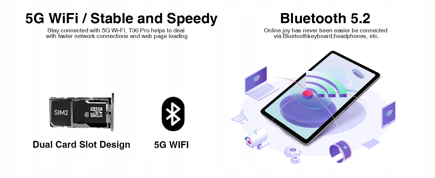 Планшет T30PRO поддерживает двухдиапазонный Wi-Fi 5G и 2,4G, который в три раза расширен и отличается от среднего однодиапазонного Wi-Fi. Вы сможете быстро развлечься онлайн, не беспокоясь о запуске игр или видео. Поддержка Bluetooth 5.2 для потоковых приложений без отключения. Вы также можете подключить карту 4G, чтобы закодировать ее, когда Wi-Fi недоступен.