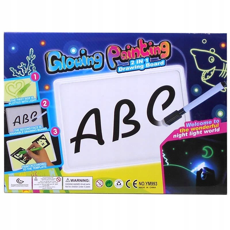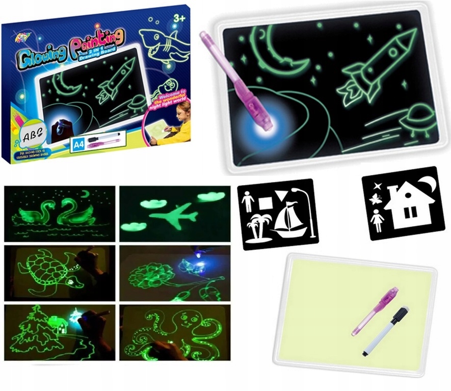 Доска 2-в-1 — идеальный подарок для любого ребенка, который любит рисовать. Благодаря этой доске он также может создавать рисунки,светящиеся в темноте. В наборе есть все необходимые элементы для создания светящихся картинок. Также включены образцы шаблонов с узорами.