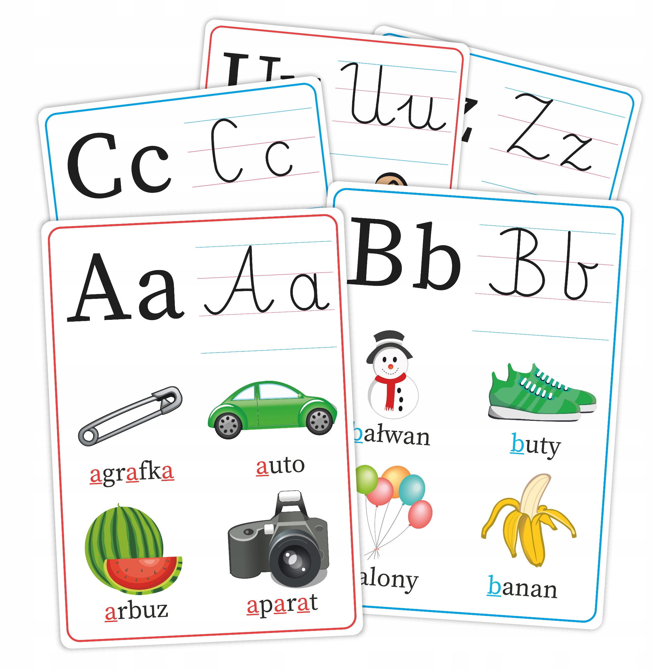 - 23 карточки - на каждой карточке изображена отдельная буква (нет польских символов, например, ĄĘ и т. д.). Для примера на каждой карточке 4 изображения.