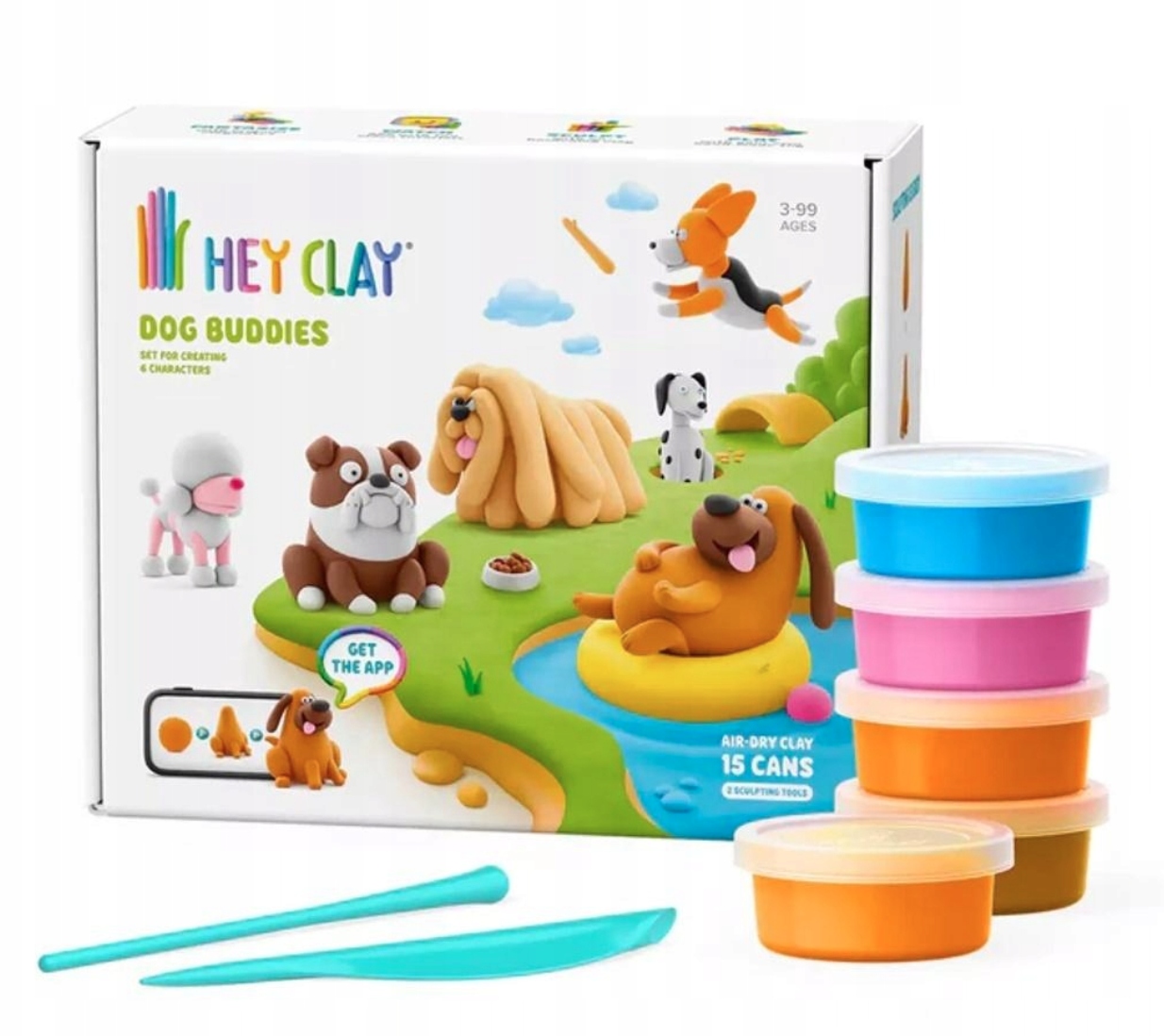 Внутри находятся 15 контейнеров с красочным, ароматным и мягким пластилином, два инструмента для лепки и код доступа к приложению Hey Clay, благодаря которым ребенок шаг за шагом научится делать милых собачек – пуделя, бульдог, далматинец, бигль и другие веселые фигурки.