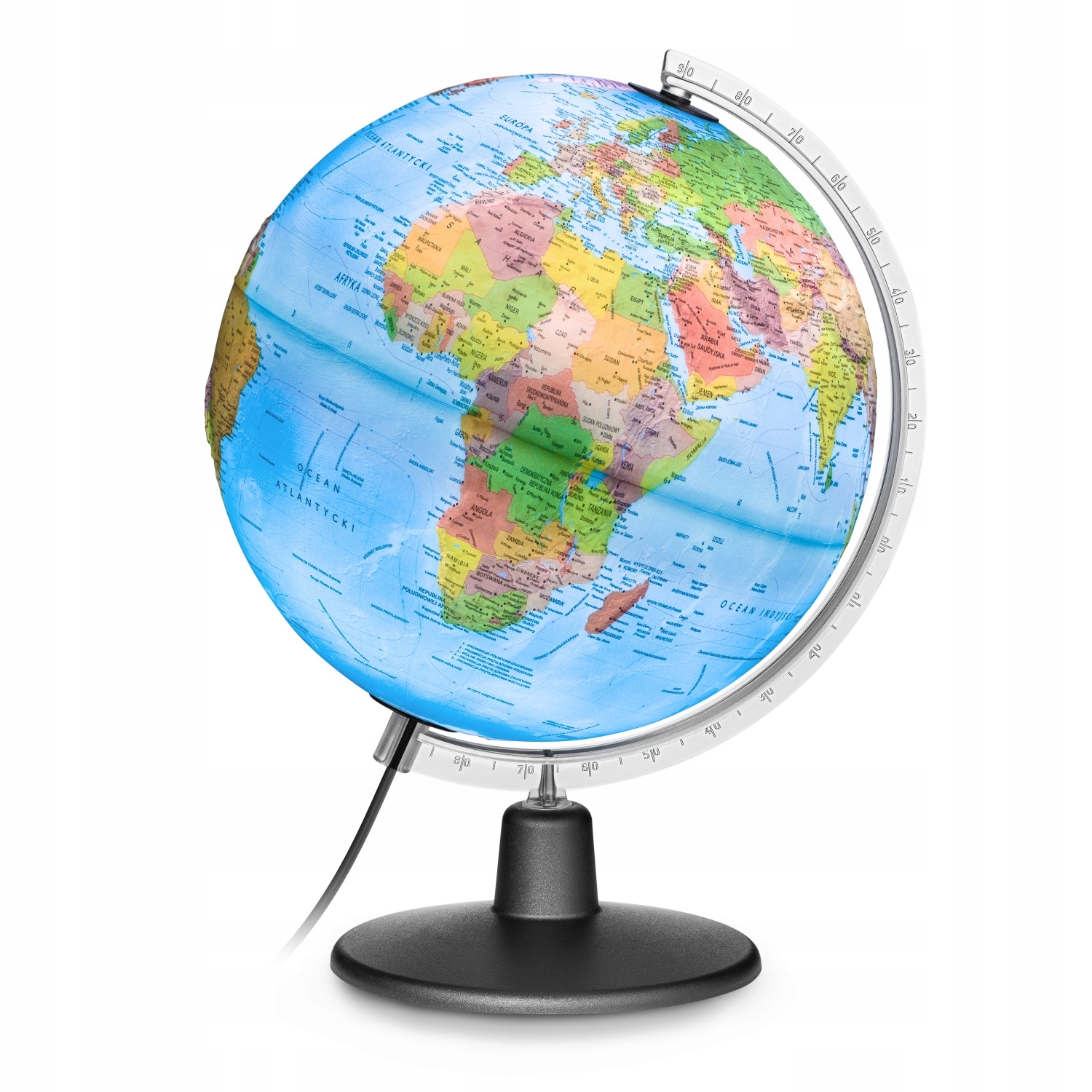 Крепится на пластиковом основании и меридиане. Карта на польском языке. Размер мяча 30 см, высота 38 см. Легкая замена лампочки.