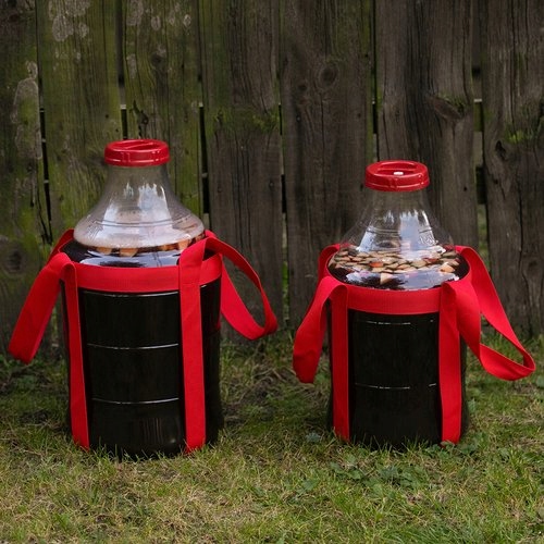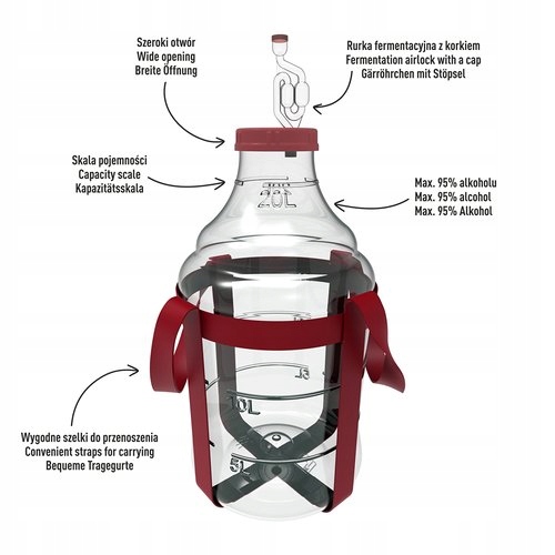 Небьющийся пластиковый баллон для вина с завинчивающейся крышкой и ремнями для переноски, 20 л - ремни, широкое отверстие, трубка для брожения, красная крышка, мерная шкала.