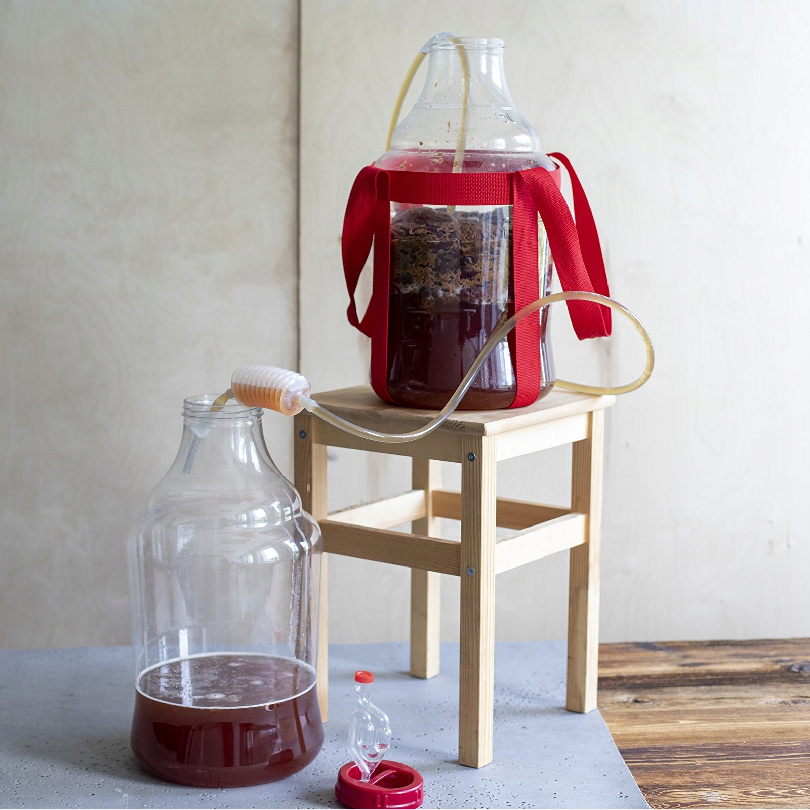 Баллон для вина из небьющегося пластика с завинчивающейся крышкой и ремнями для переноски, 25 л - ремни, широкое отверстие, трубка для брожения, красная крышка, мерная шкала.