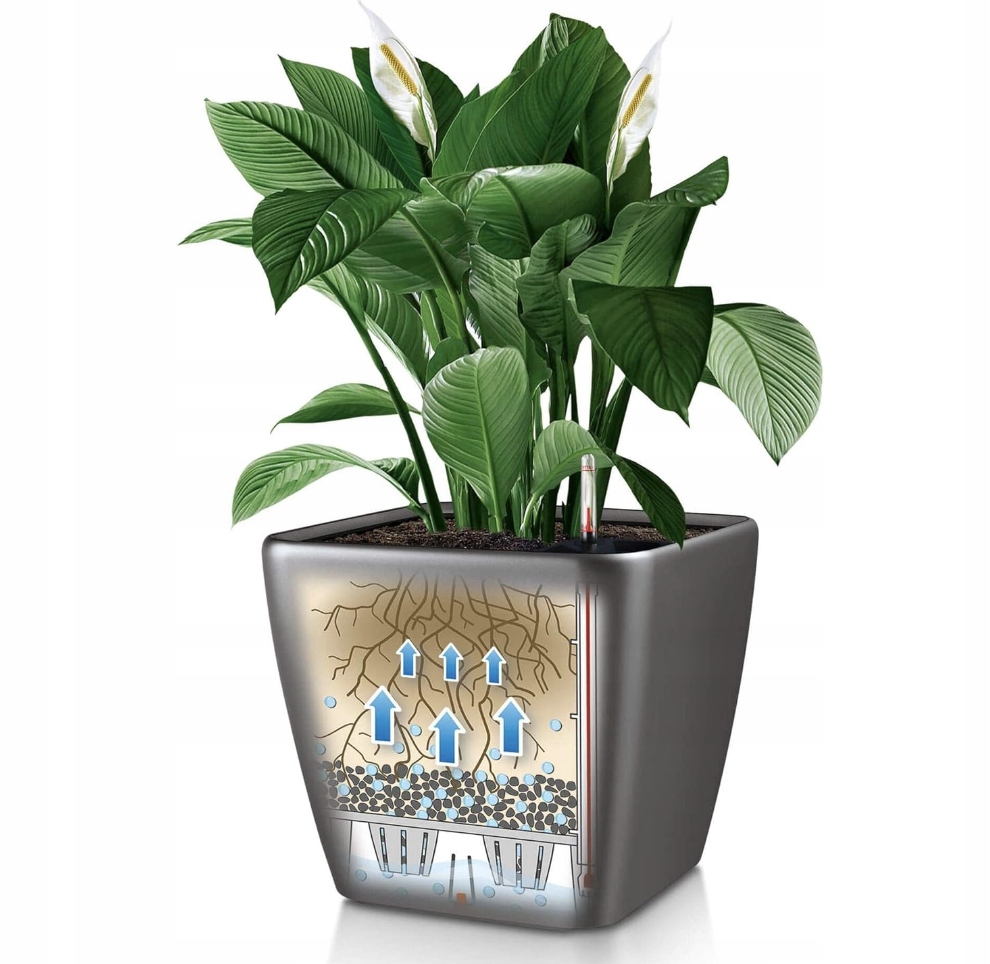- Система ирригации Lechuza, интегрированная с кастрюлем, обеспечивает растения с правильным количеством воды; Практический уровень воды для контроля полива