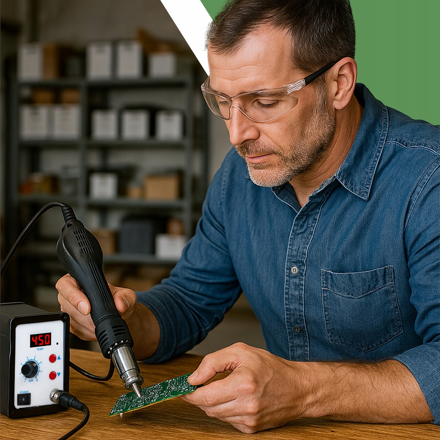 Прозрачный светодиодный экран показывает параметры тока и установки: Интенсивность температуры и выдувания . Благодаря этому вы можете точно адаптировать работу устройства и избежать перегрева материала. Даже начинающий пользователь сразу же видит, являются ли настройки правильными и могут быстро их исправить. Этот уровень контроля снижает риск повреждения и повышает эффективность ремонта.