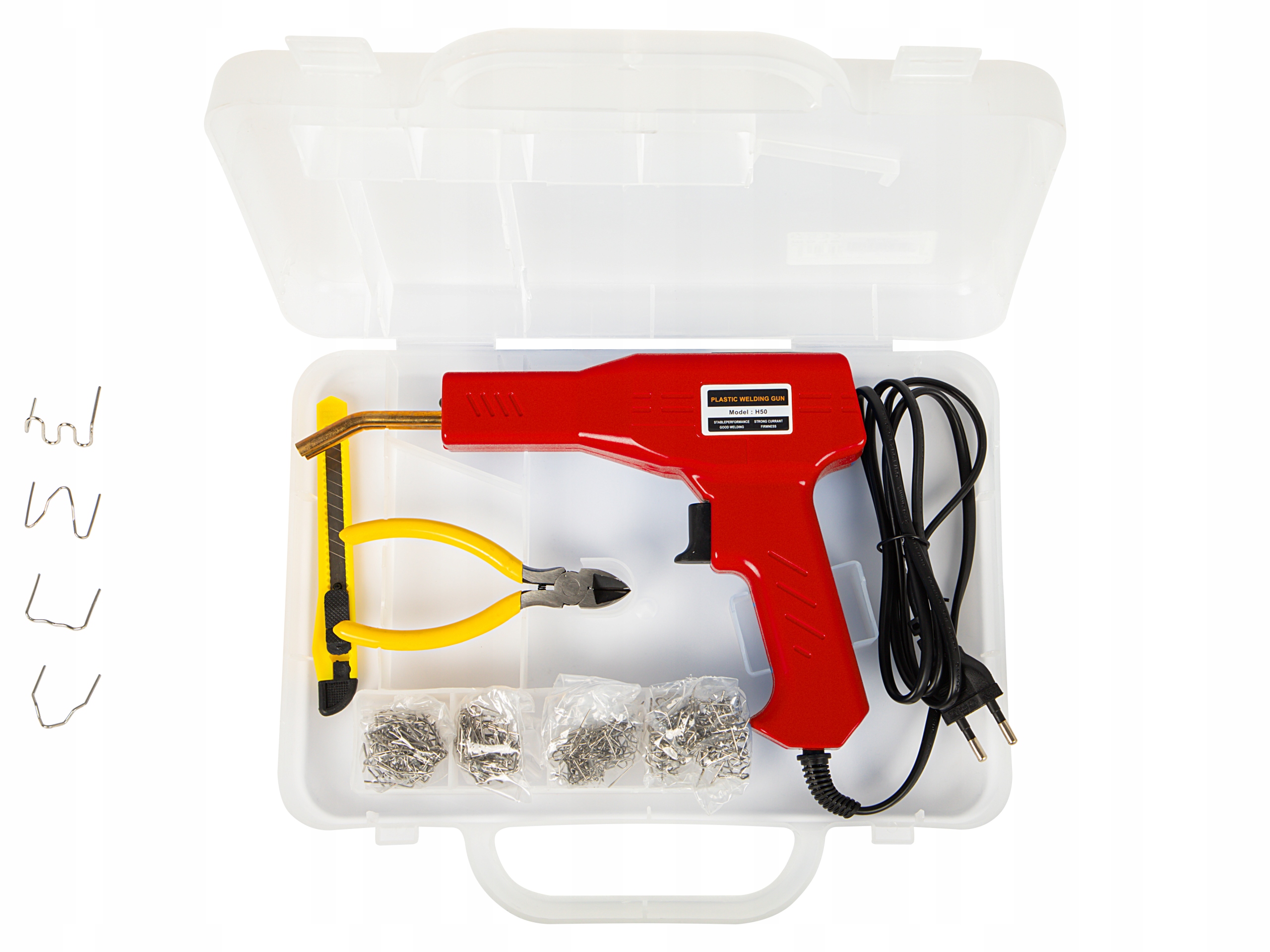 Компактная пластиковая сварочная машина. В съемочной площадке 200 стальных пластиковых основных продуктов (4 типа 50 штук) и нож и плоскогубцы для формирования пластика. Отличный набор для ремонта пластиковых элементов, сварки пластмасс и маскировки всех трещин. Набор также включает в себя удобный случай, который будет способствовать передаче и хранению всех элементов. h2>