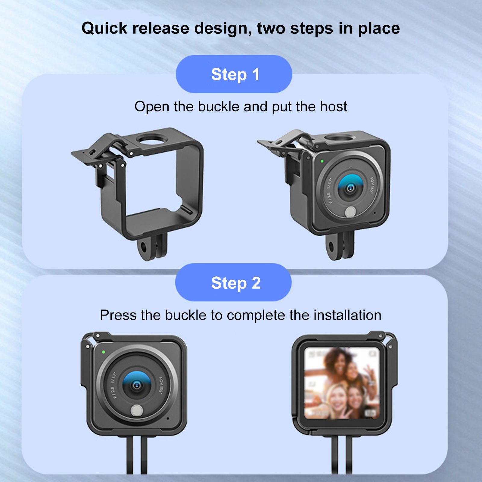 3. Быстрый дизайн: первый шаг - открыть пряжку и разместить хост камеры. Второй шаг - нажать пряжку, чтобы завершить установку.