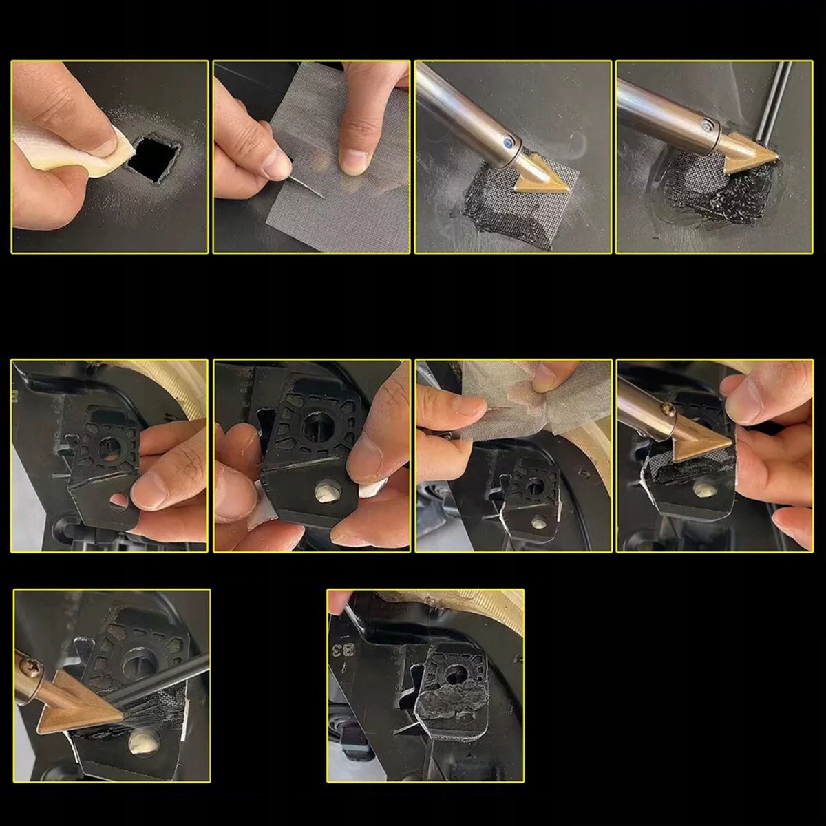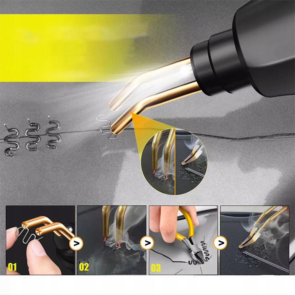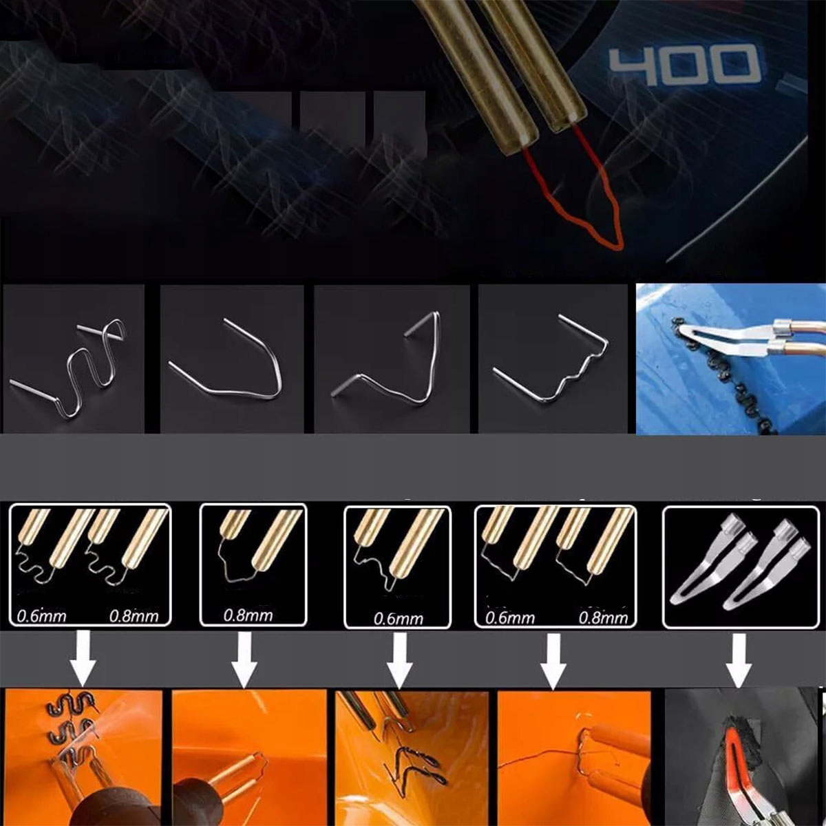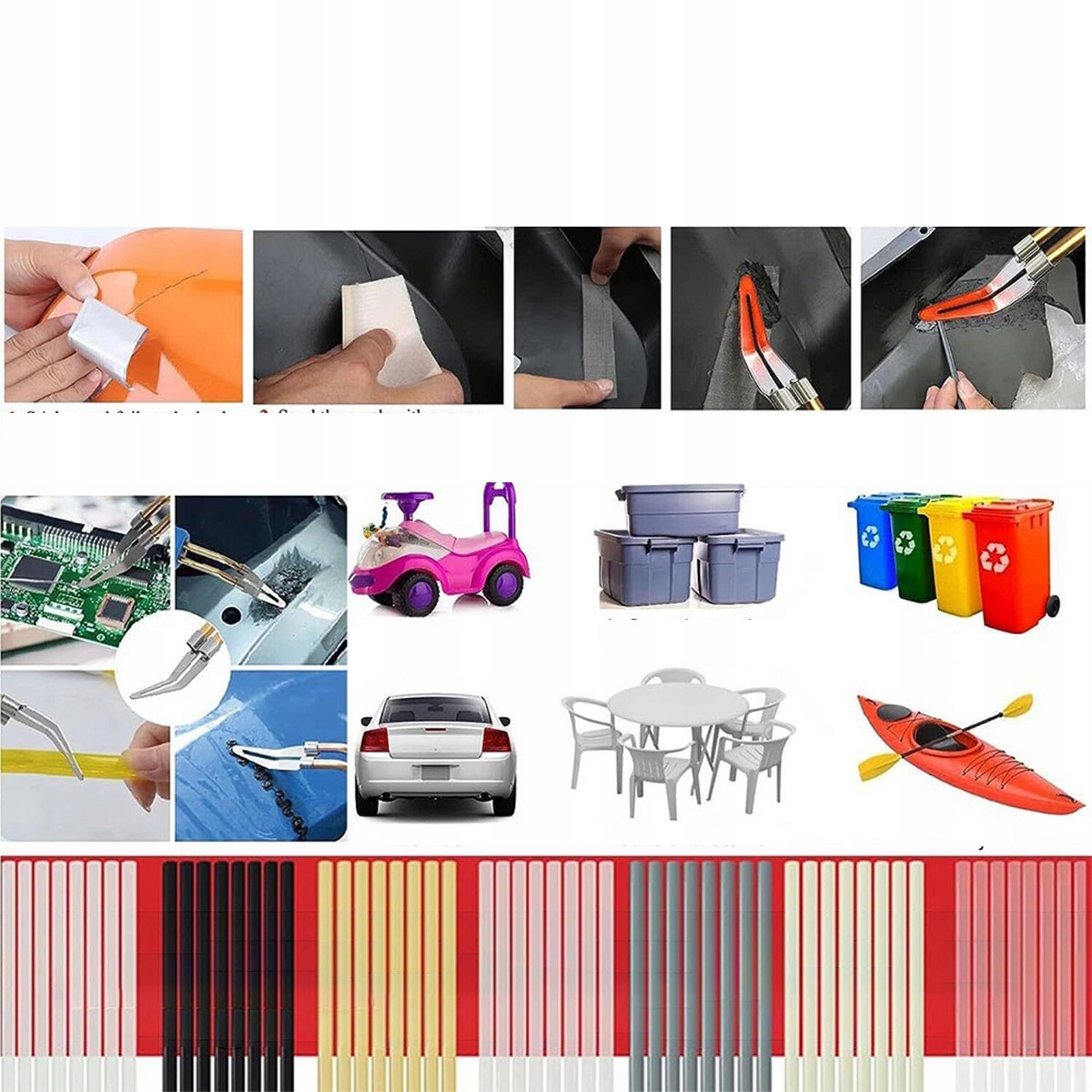 Ремонт не менее 98% пластмасс, доступных на рынке. Идеально подходит для ремонта: бамперы, панели мониторинга, лампы, пластиковые кольца, холодильники, спойлеры, дверные ручки, фары, пластиковые крылья, пластмассы для автомобилей и мотоциклов и т. Д.
