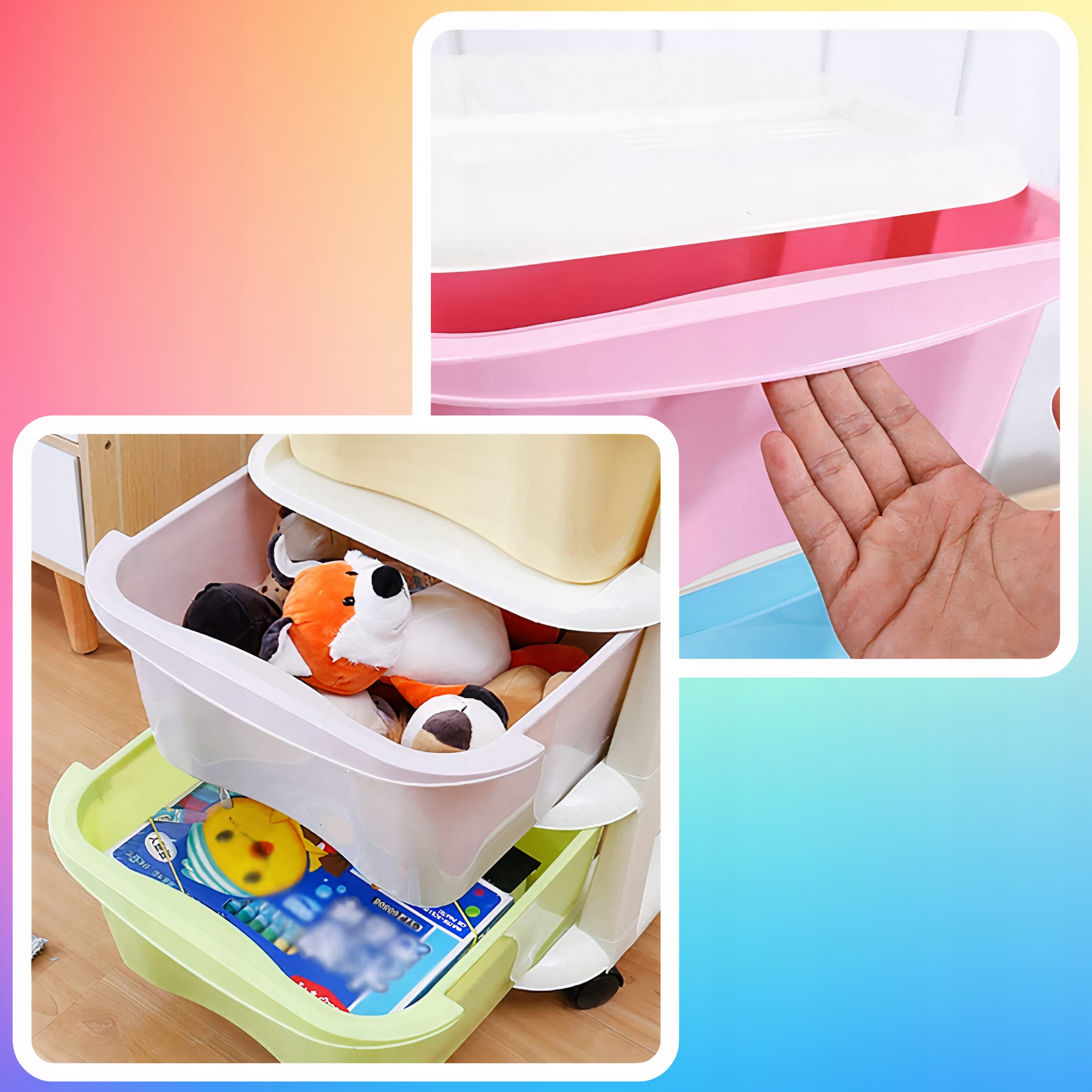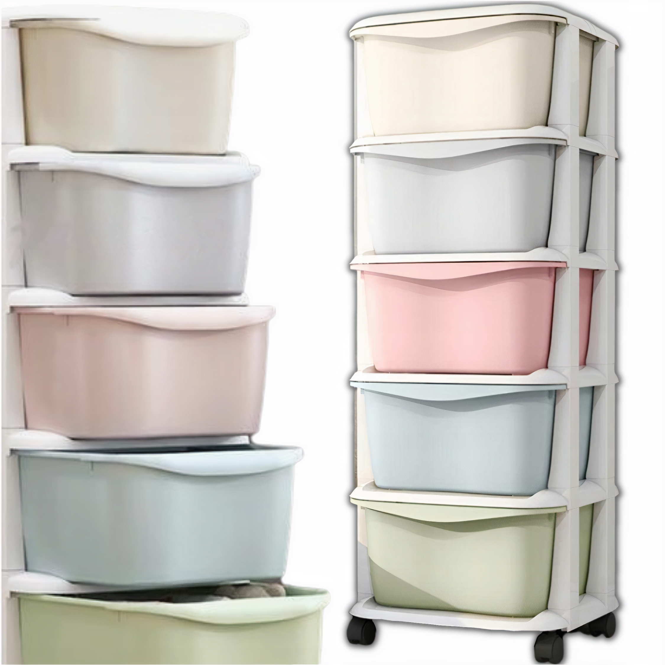 Пять ярких ящиков пастельных тонов обеспечивают достаточно места для хранения различных предметов, а удобные ручки позволяют легко их открывать и закрывать.
