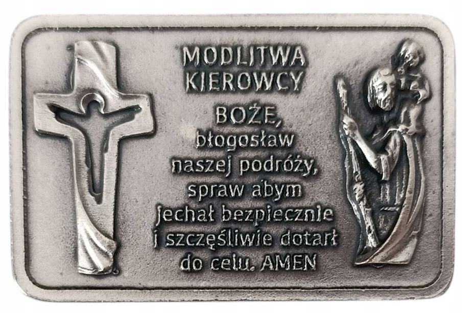 - Пластик с водительской молитвой, сделанной из окисленного серебряного металла.