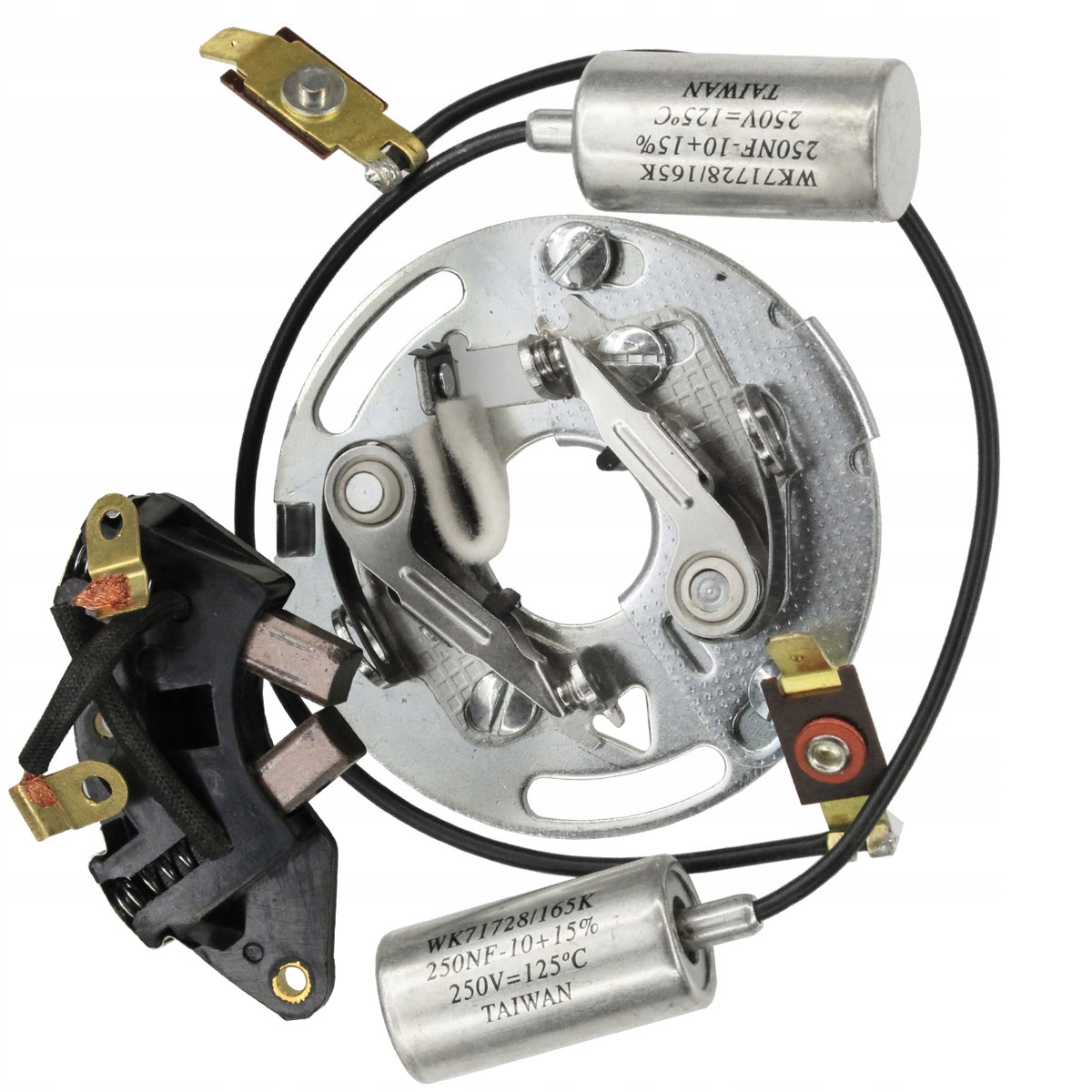 В комплект входят: Пластина зажигания, 2 платиновые клеммы, 2 конденсатора + щеткодержатель.