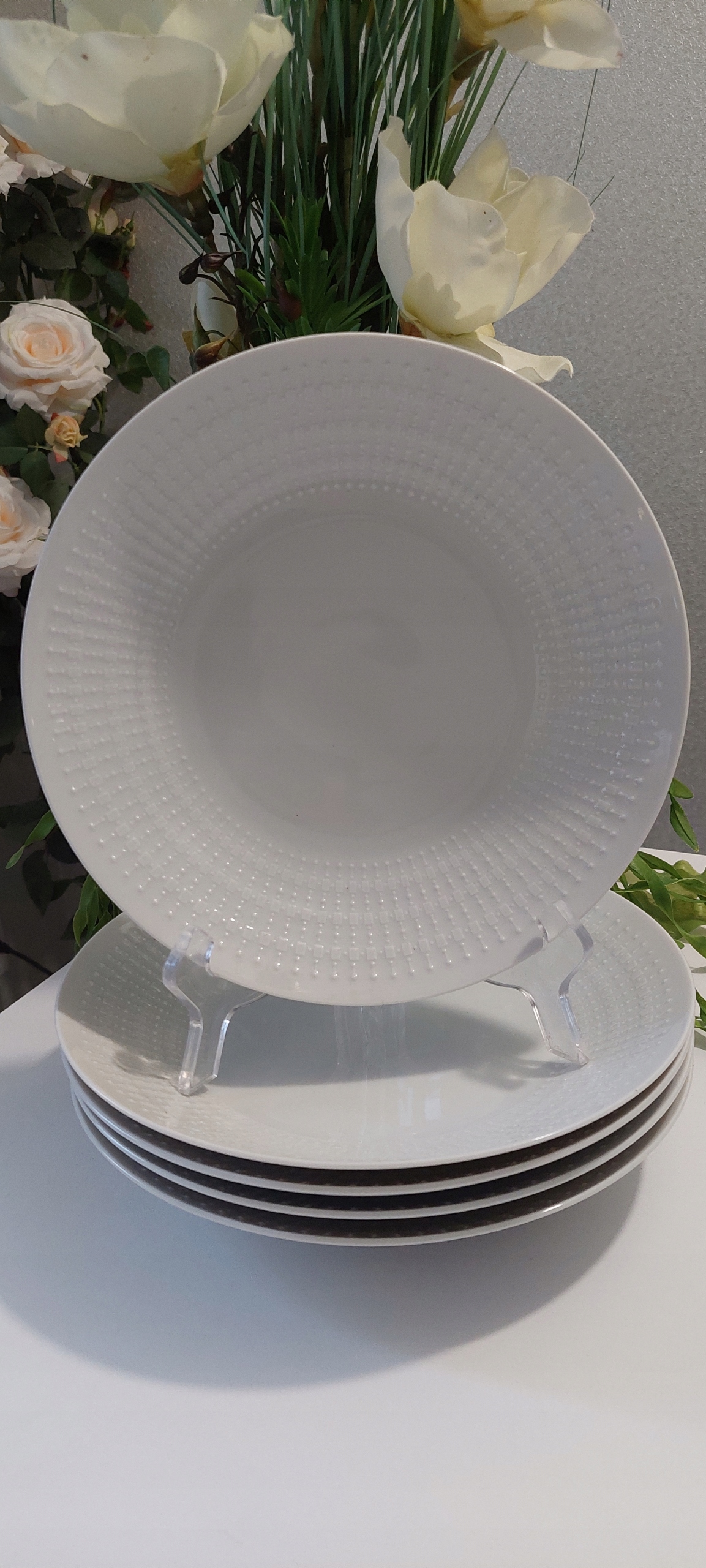 Пять глубоких пластин в очень хорошем состоянии с высотой размеров 4 см, диаметром наполнителя 23 см.