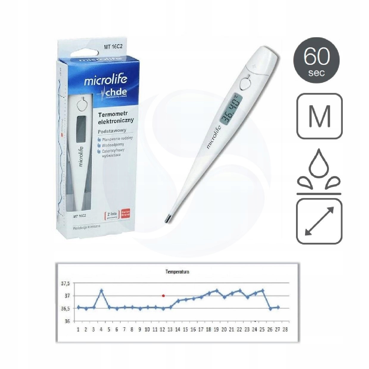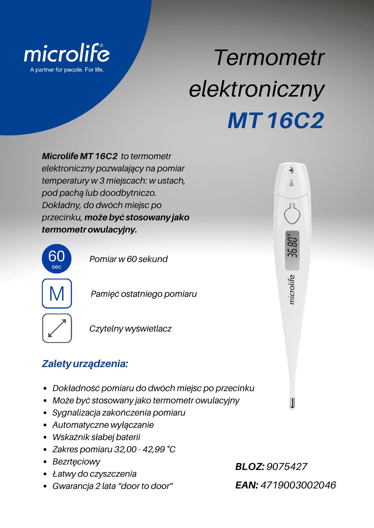 Электронный термометр Microlife MT 16C2 — медицинский прибор, используемый для измерения температуры тела. Устройство водонепроницаемо, температура показывается с точностью до двух десятичных знаков. После измерения, если термометр Микролайф не был выключен, он выключается автоматически. Электронный термометр Microlife MT 16C2 можно использовать в качестве термометра овуляции. Электронный термометр имеет сменную батарейку, о необходимости ее замены информирует графический значок.
