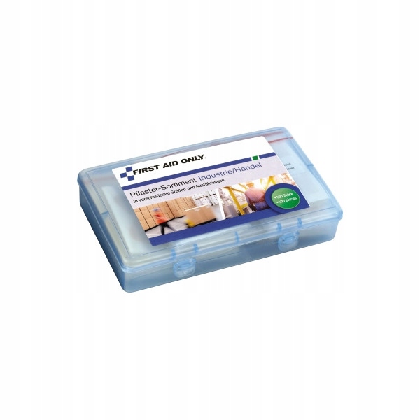 Упаковка. Ассортимент промышленных/коммерческих пластырей «Только первая помощь» поставляется в закрывающейся пластиковой коробке. В комплекте различные текстильные пластыри с эластичной тканью: 10 повязок на суставы пальцев (7,5 х 4 см), 10 повязок на кончики пальцев (5 х 4 см), 10 повязок на пальцы (12 х 2 см), 15 маленьких пластырей (1,9 х 7,2 см). см), 15 пластырей (2,5 х 7,2 см) и 10 овальных пластырей (5 х 7 см). В комплект также входят 10 водонепроницаемых прозрачных овальных пластырей (5 х 7 см), 10 текстильных быстронаматывающих повязок (10 х 6 см) и 10 гипоаллергенных белых нетканых быстронаматывающих повязок (10 х 6 см). Все пластыри индивидуально завернуты в бумагу, каждый тип пластырей упакован в отдельные полиэтиленовые пакеты. Ассортимент пластырей идеально подходит для оказания первой помощи при небольших травмах.