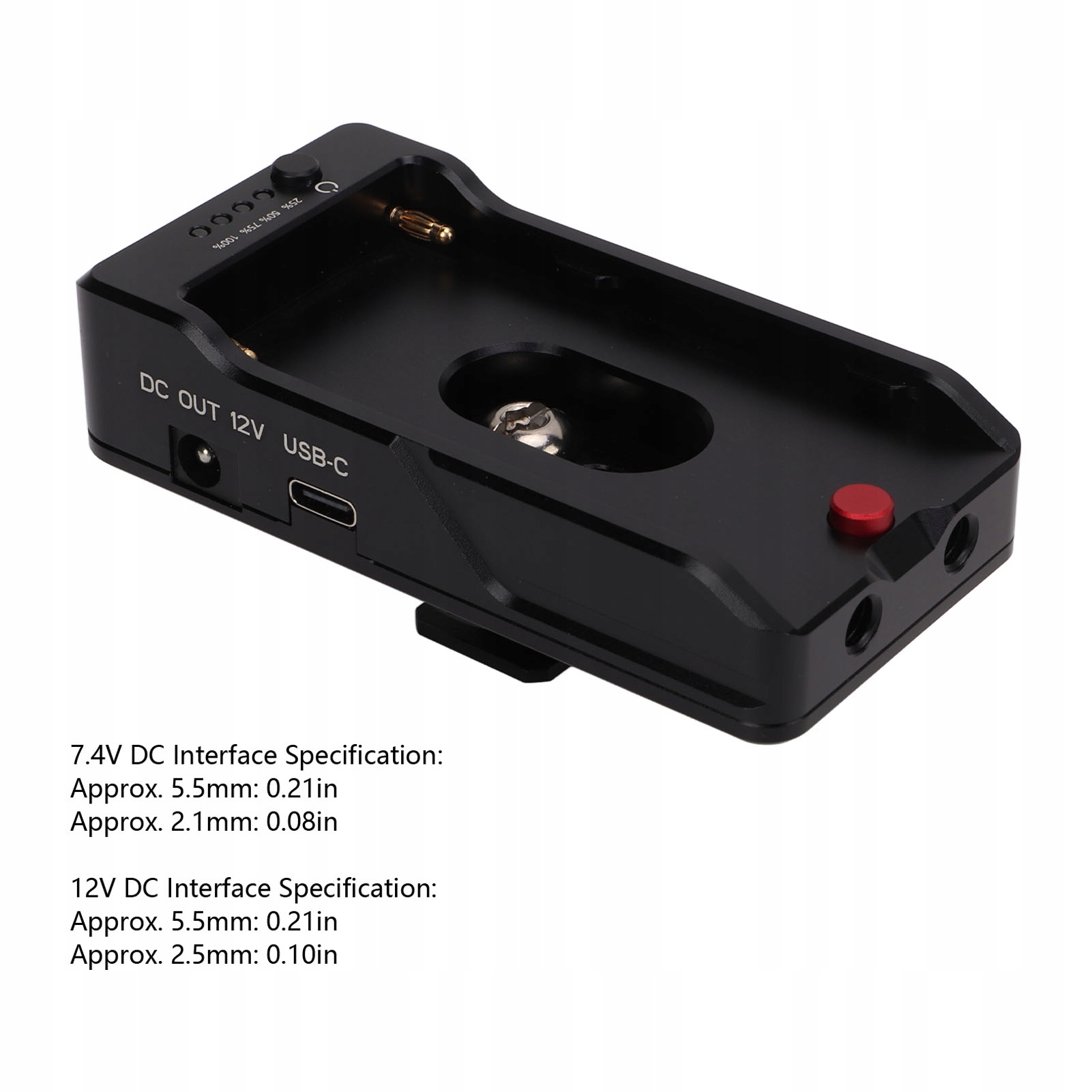 - Спецификация интерфейса постоянного тока 7,4 В: прибл. 5,5 x 2,1 мм / 0,21 x 0,08 дюйма