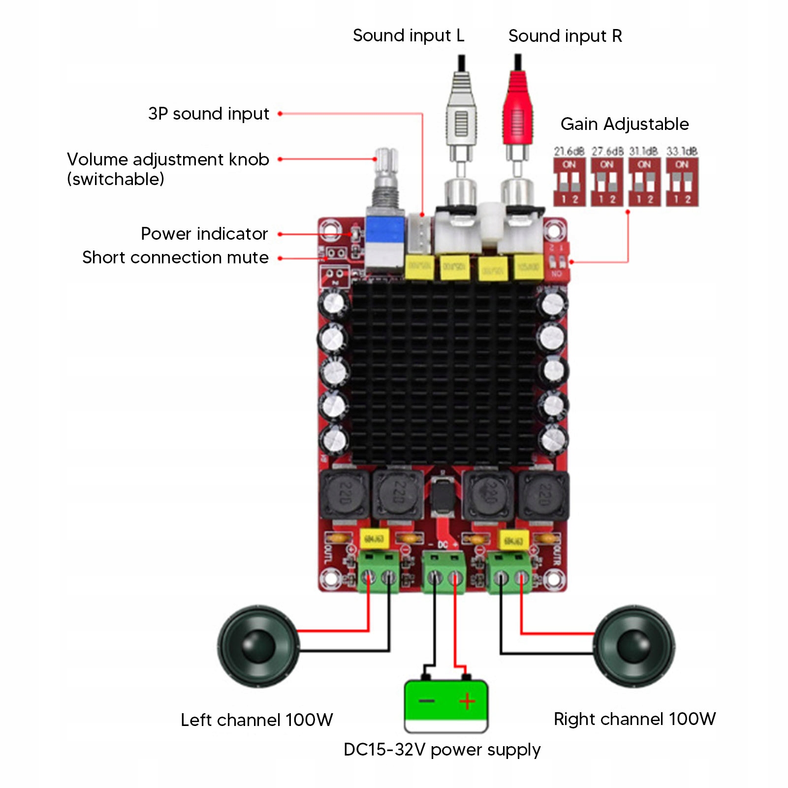1. Выходная мощность: профессиональная двухканальная плата усилителя звука класса D TDA7498, плата усилителя звука класса D 100 Вт + 100 Вт.