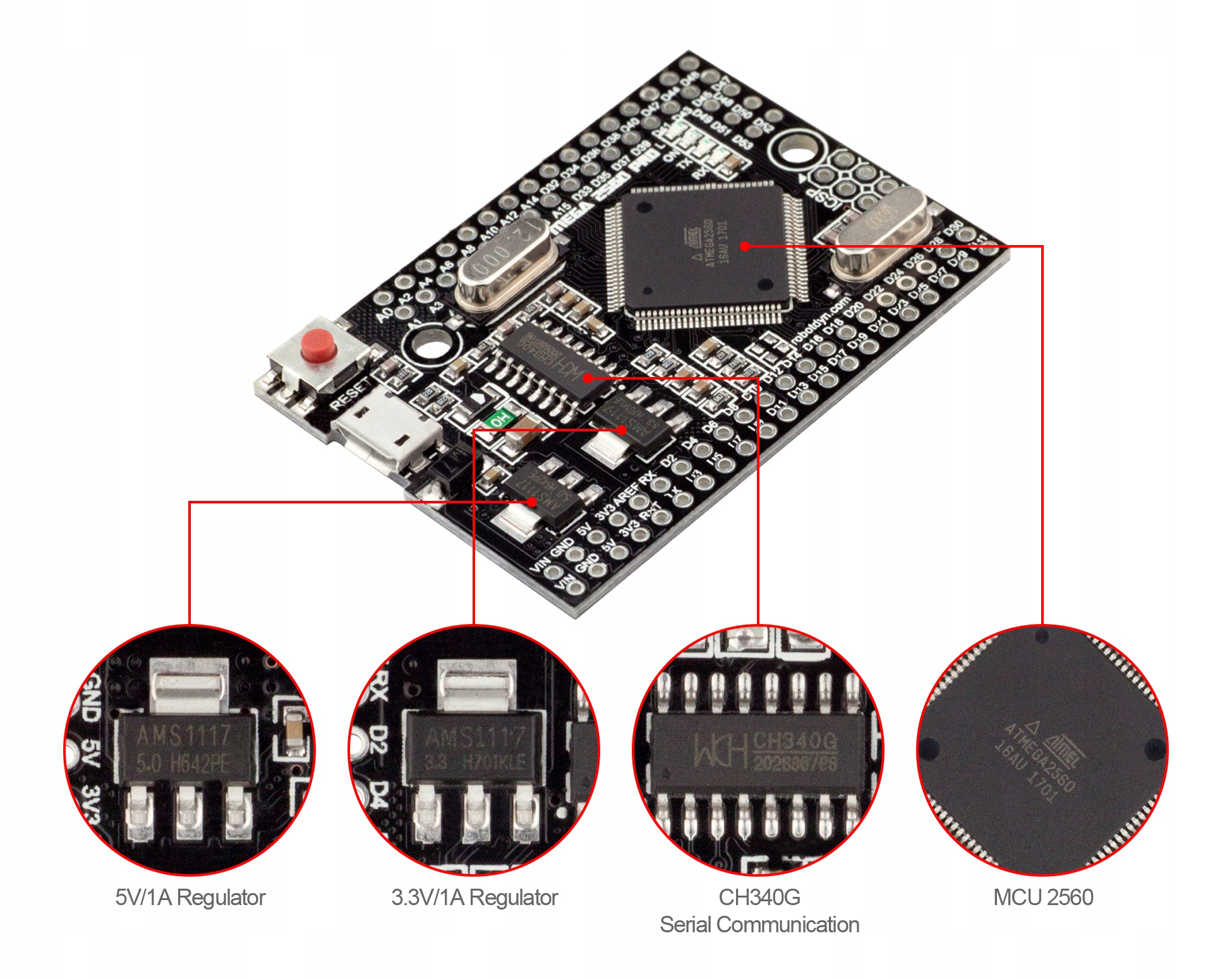 Mega 2560 PRO — плата на базе микроконтроллера AVR ATmega2560, того же, который используется в системах ARDUINO MEGA. Модуль программно совместим с системами ARDUINO, имеет предварительно загруженный загрузчик и может быть запрограммирован через USB-порт, например, из среды ARDUINO IDE.