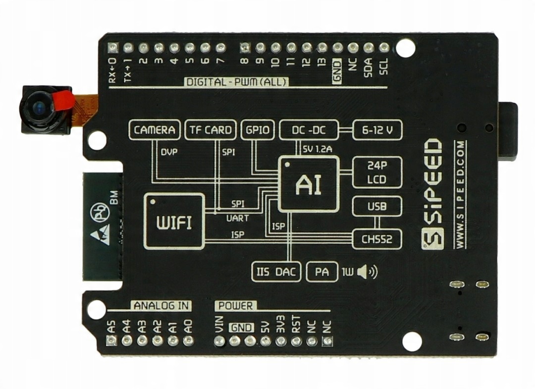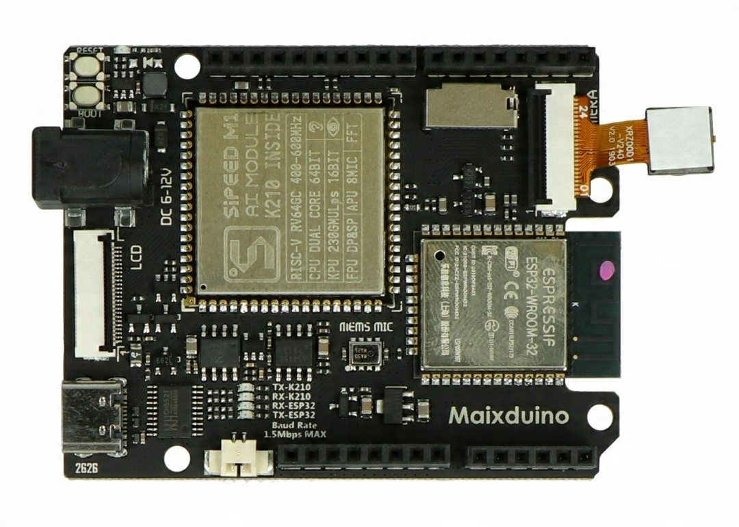 Maixduino AI — плата разработки в формате Arduino UNO, предназначенная для работы с искусственным интеллектом. Плата основана на процессоре K210 RISC-V AI и оснащена модулем MI AI и модулем ESP32, а также модулем беспроводной связи. через Bluetooth и Wi-Fi.