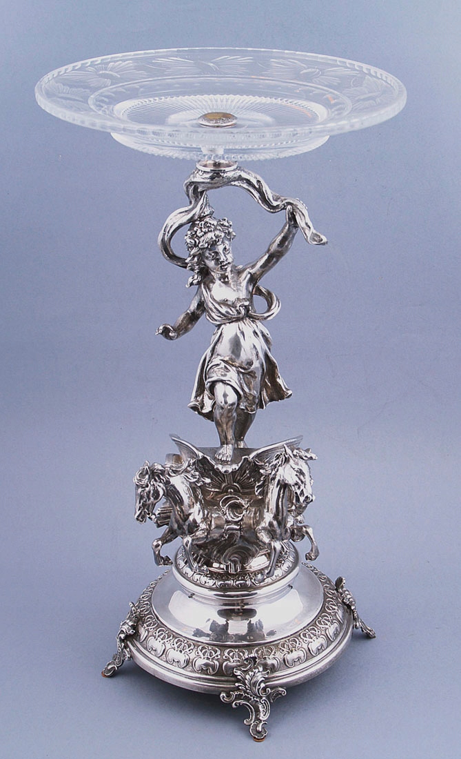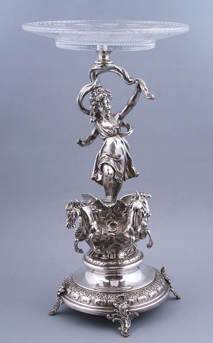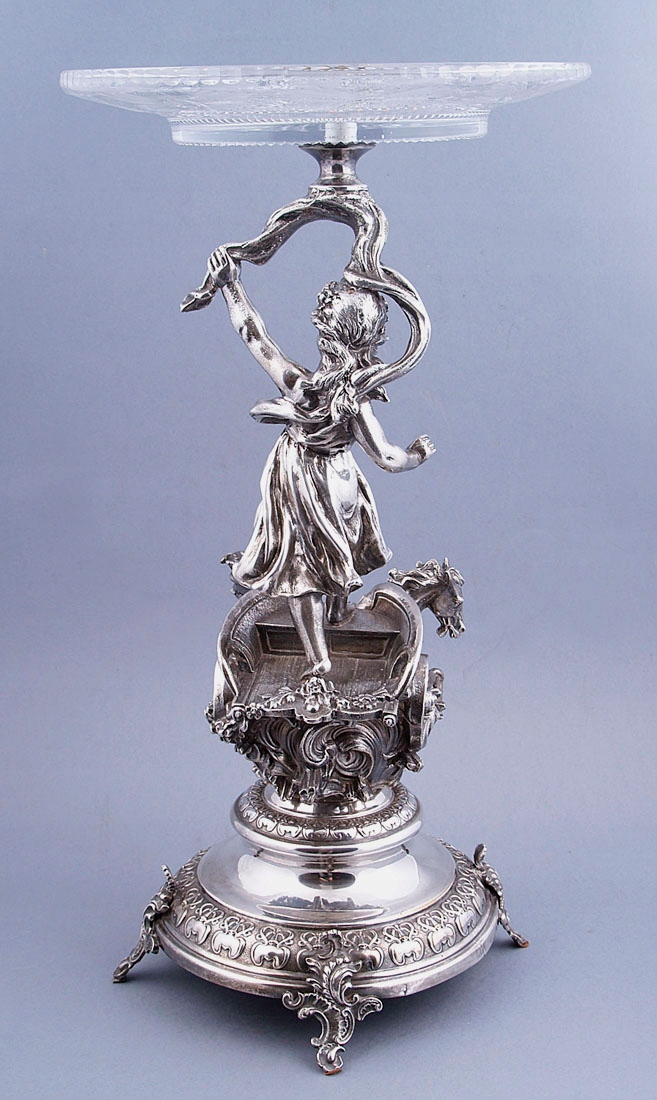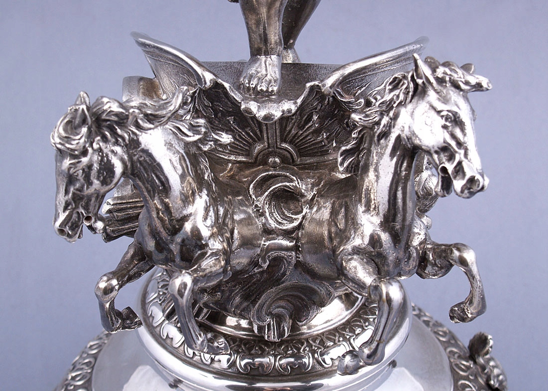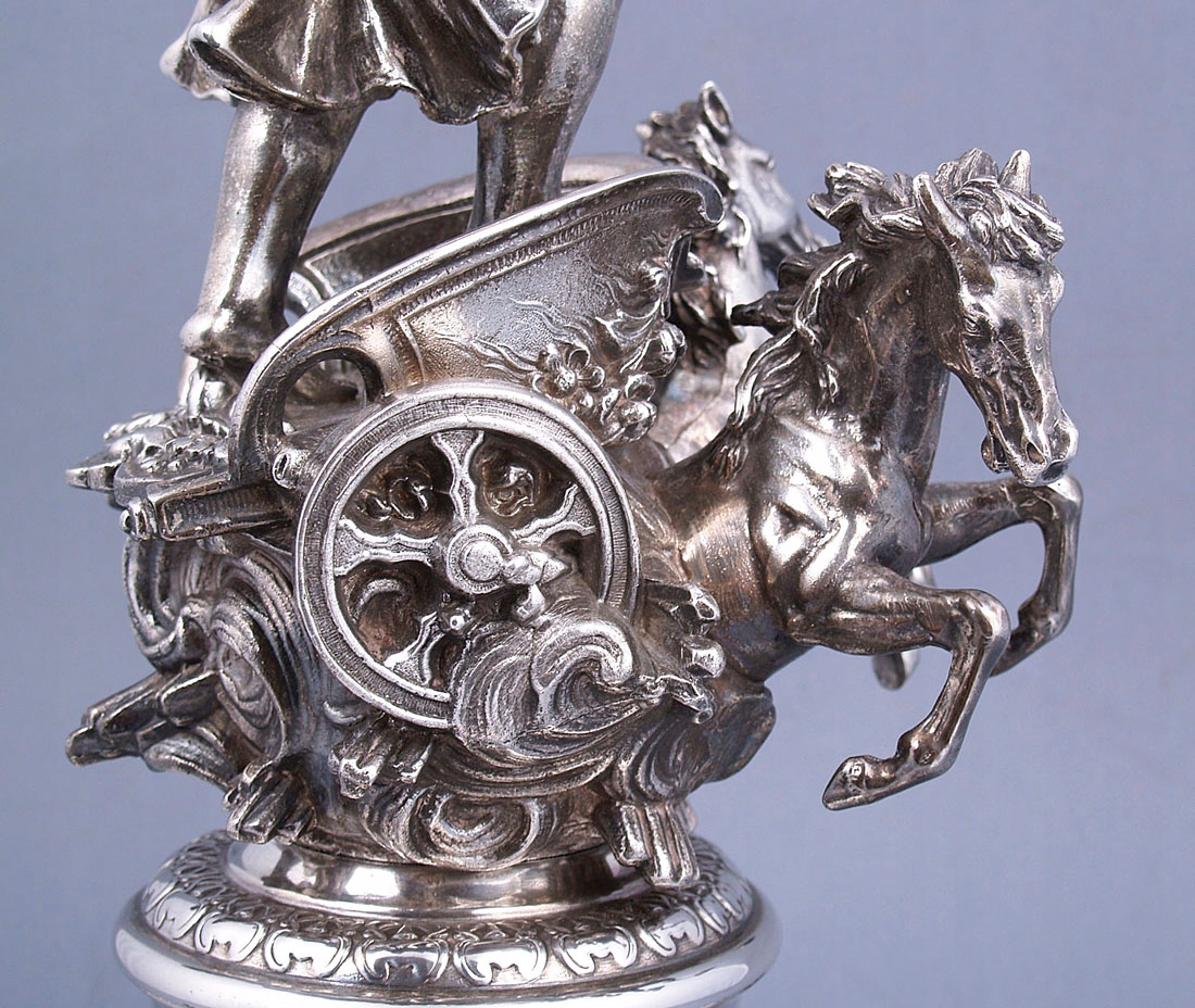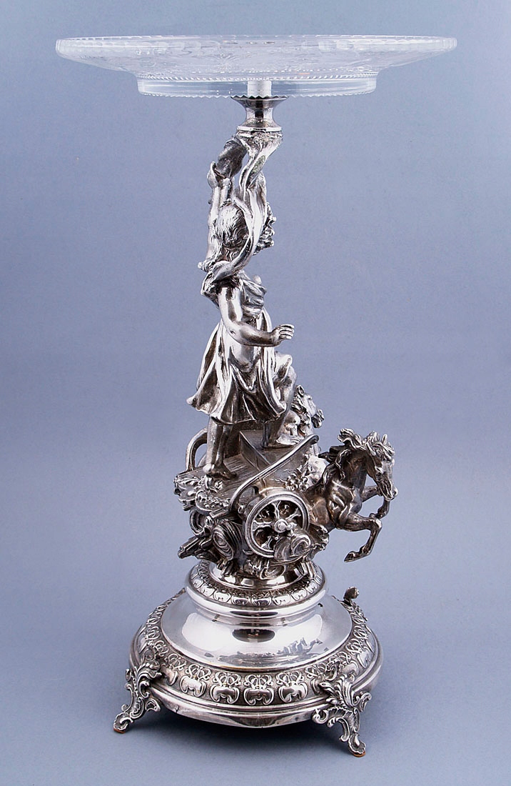 с круглым основанием с четырьмя ножками, выгравированными в виде листьев. Вверху, на полированном своде, колесница со скачущими двумя лошадьми и в ней фигура женщины Эос. Над головой у нее в одной руке раскидистый пояс, увенчанный хрустальной тарелкой.
