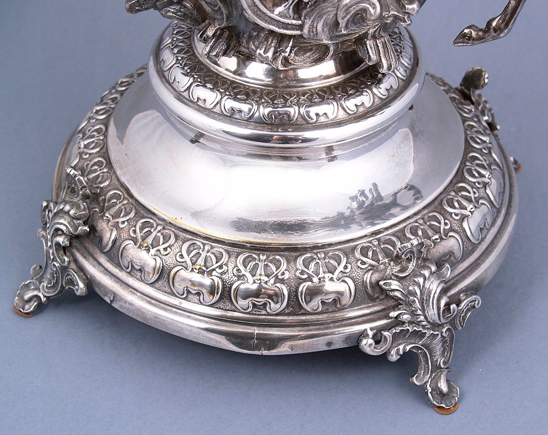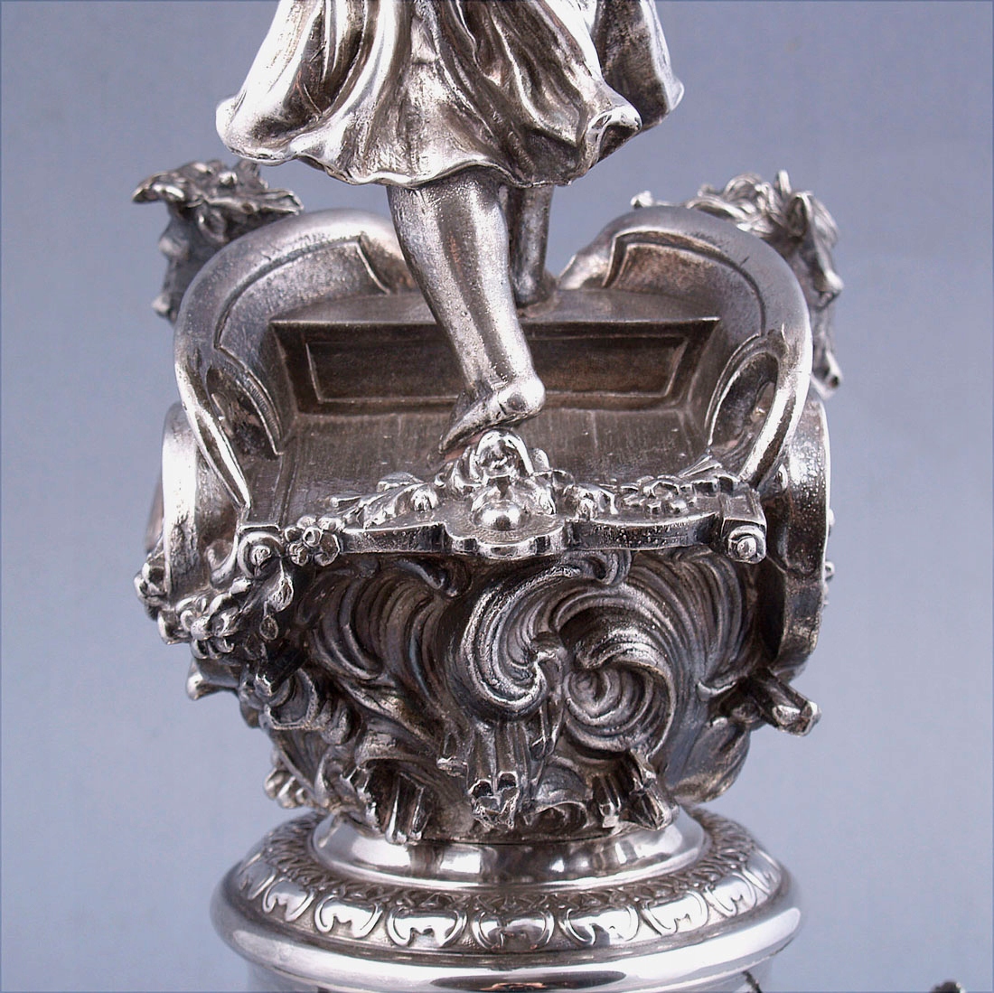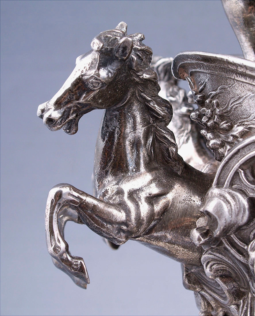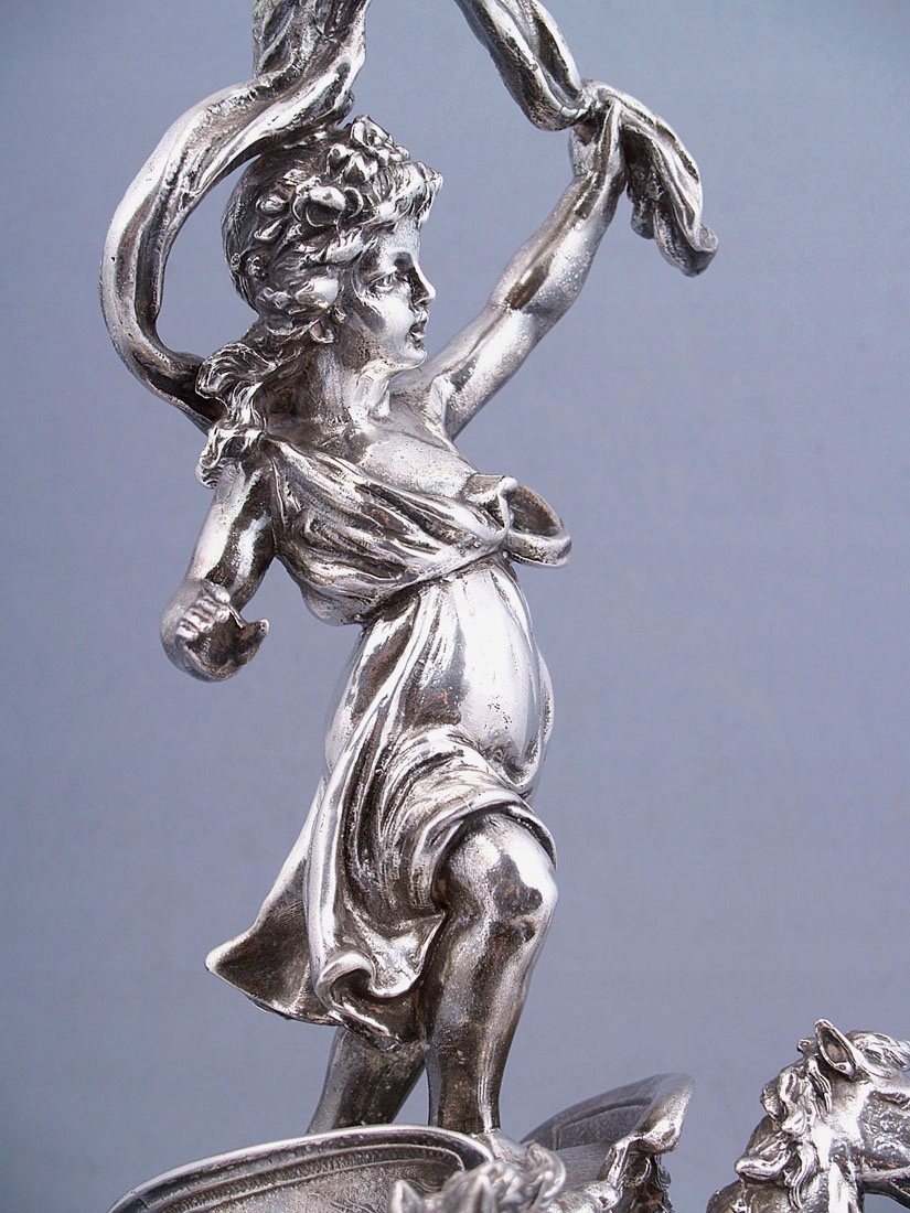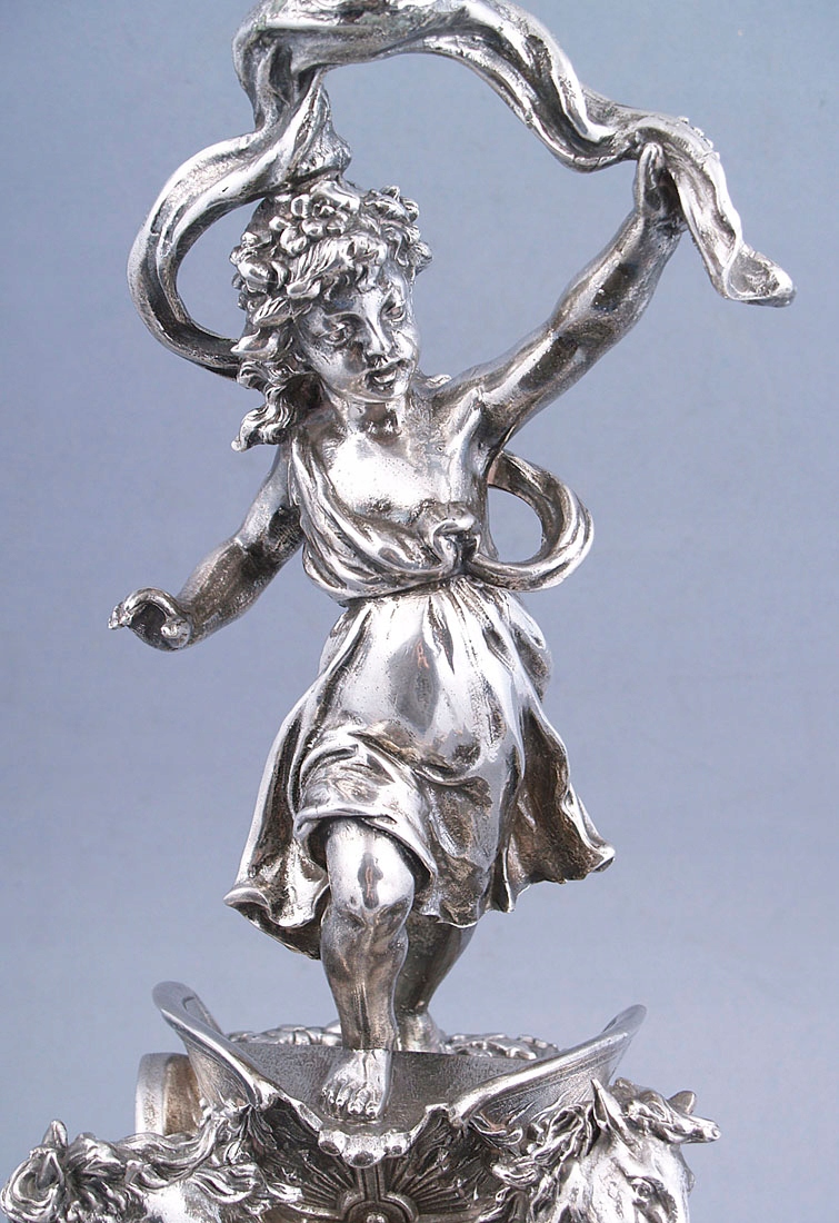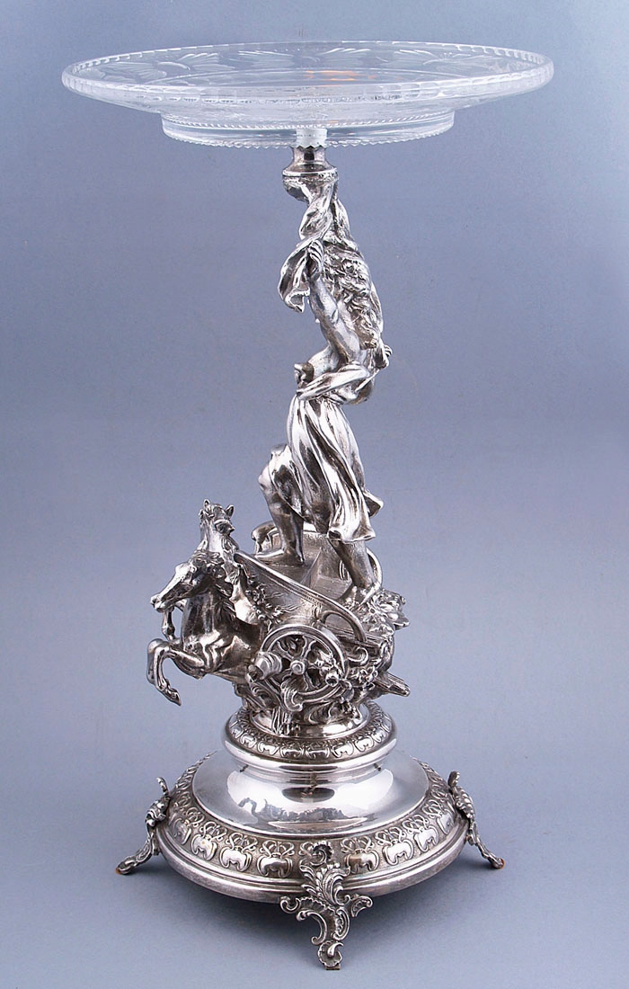 с круглым основанием с четырьмя ножками, выгравированными в виде листьев. Вверху, на полированном своде, колесница со скачущими двумя лошадьми и в ней фигура женщины Эос. Над головой у нее в одной руке раскидистый пояс, увенчанный хрустальной тарелкой.
